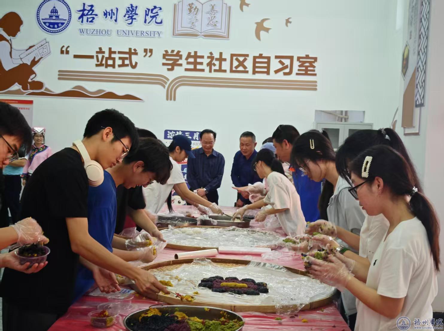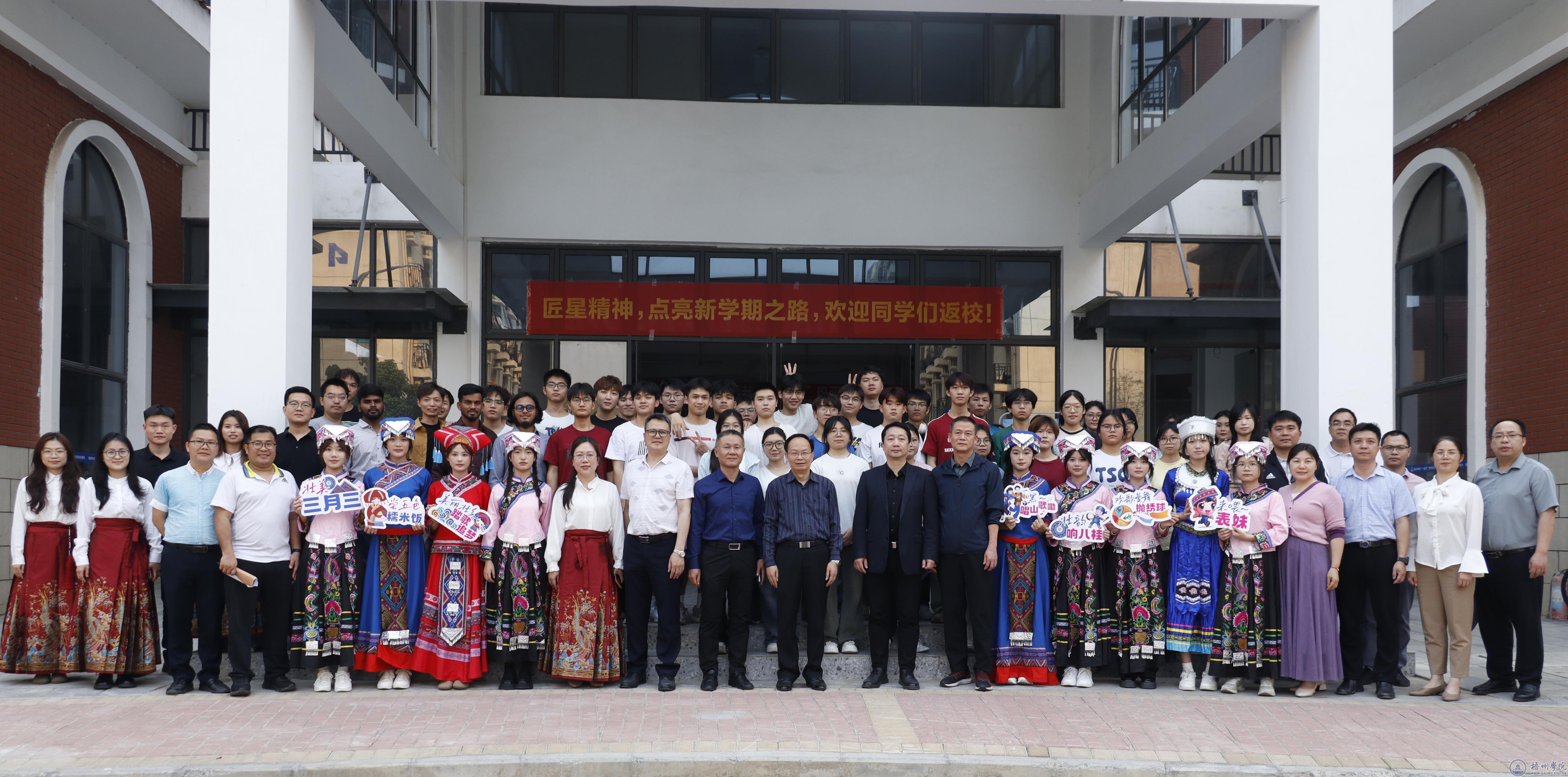 3月26日下午,学校党委副书记梁业华、副校长覃雄彪到北片区9号楼“一站式”学生社区参加铸牢中华民族共同体意识“广西三月三”校园民俗文化活动,与在场一百多名中外师生体验民俗风情,感受传统文化的独特魅力。活动由学生工作处主办,机械与资源工程学院承办。学生工作处、各二级学院相关负责人参与活动。