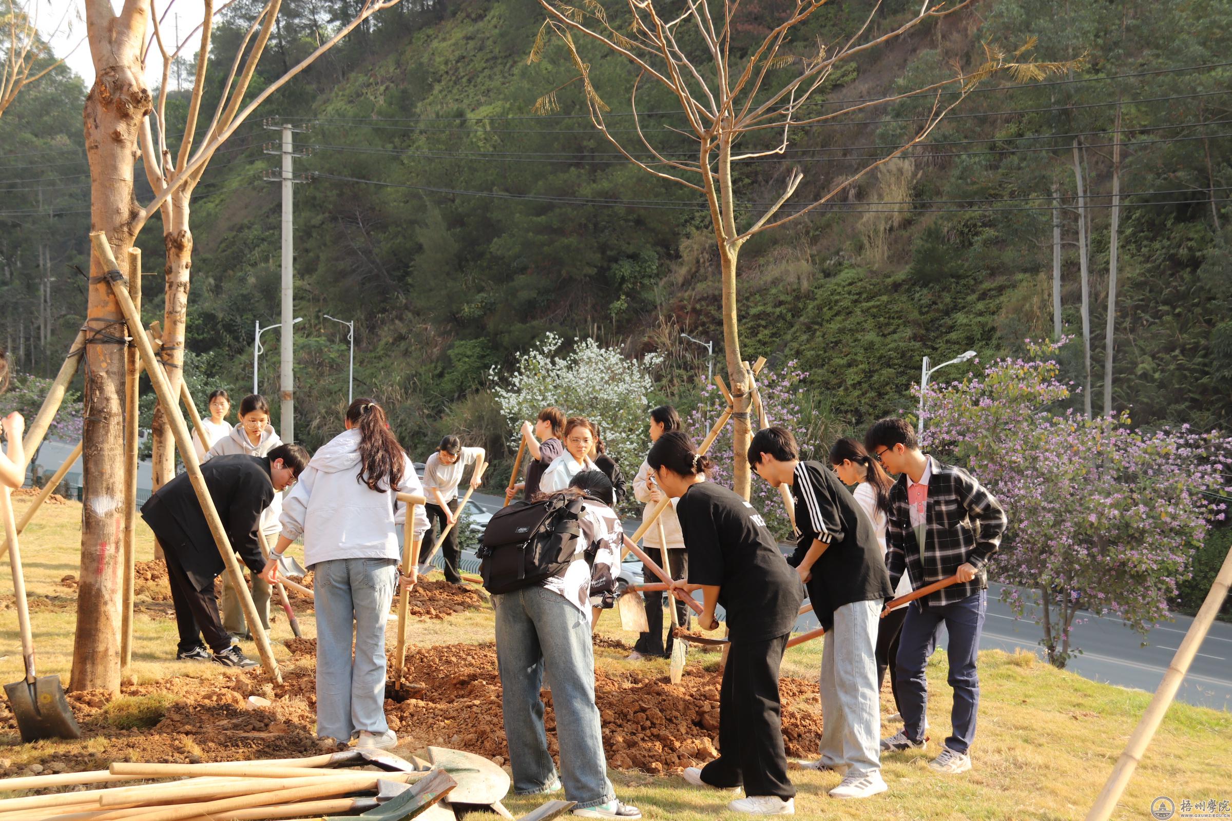 3月12日上午,我校于北片区田径场看台后侧空地开展2025年植树节活动。学校领导童晓晖、麻新纯、梁业华、覃雄彪、莫晨宇,各部门、各单位教职员工代表、学生代表共100余人参加植树活动。