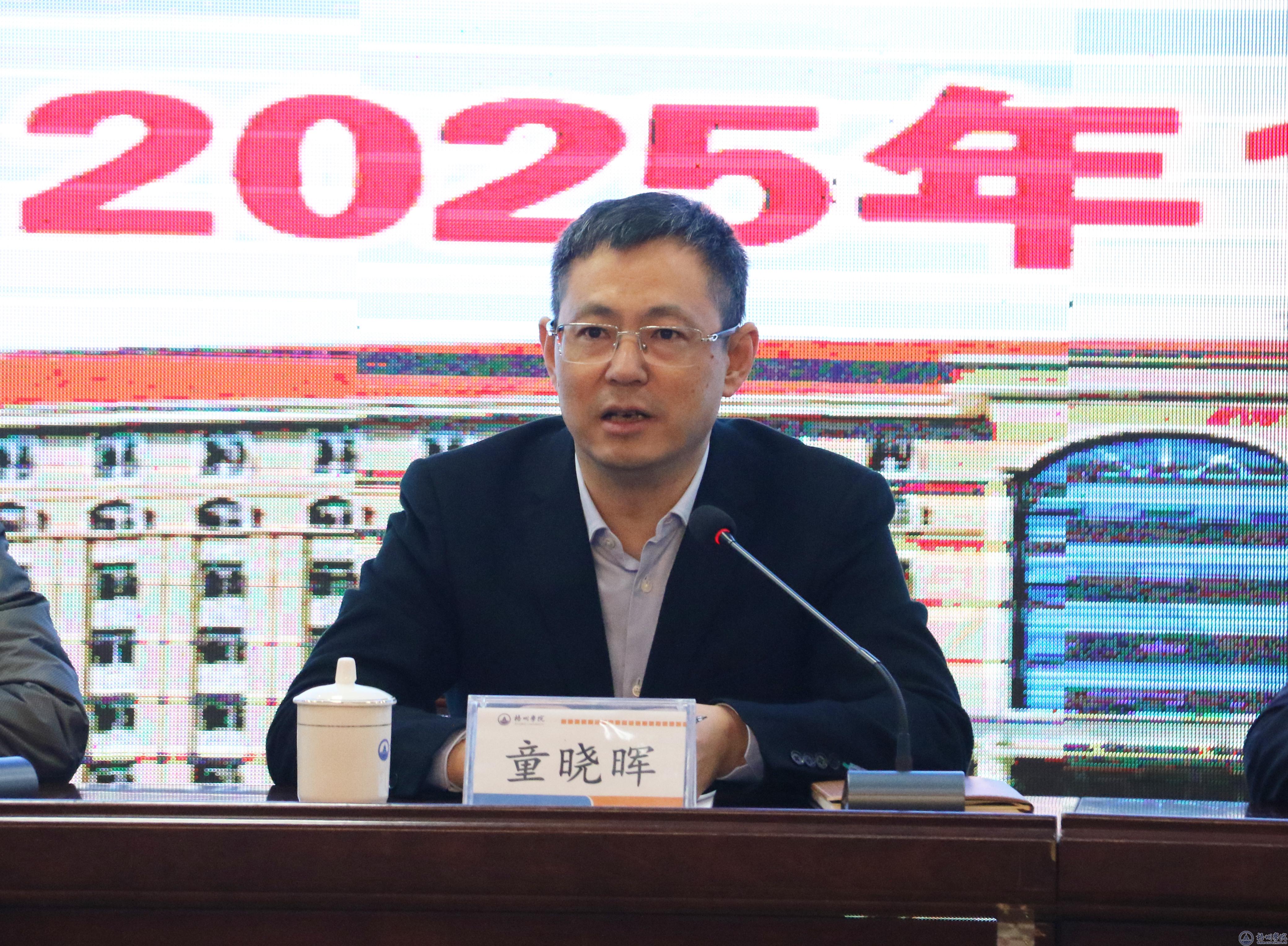 学校党委书记童晓晖在讲话中首先对全校师生员工一年来的辛勤付出表示感谢,并以“有失有得,人间清醒;对标对表,整装出发”十六个字总结了学校2024年工作状态。童晓晖书记指出,虽然学校已取得了一些成绩,但“标兵渐远、追兵已近”的态势更加紧迫,“不进则退、慢进则亡”的压力空前巨大。面对学校未来可持续发展的后劲和核心竞争力问题,童晓晖书记指出要抓住好的机遇、好的文化、好的蓝图以及好的团队四点关键性因素,以更为长远的目光、更为宽阔的视野来统一思想、谋篇布局,充分挖掘、激发学校未来事业发展的潜力与后劲路径的突破点,具体包括抓机遇、重设计、挖潜力。童晓晖书记强调,全校师生要明确重点、坚定目标,全力抓好中心工作任务;着眼全局、主动求变,全面推进我校重点领域改革;引培并举、质量为上,持续加强人才引进培养力度;拓宽视野、加强合作,持续推动学校办学开放性;开源节流、拓展资源,为学校发展提质增效。全体梧院人要信心满怀、志在千里、提振精神、鼓足干劲、阔步前行,推动学校事业高质量发展再上新高度,为以中国式现代化推进强国建设贡献梧院力量,以更长远的目光、更宽阔的视野去谋划属于梧院人的美好未来。