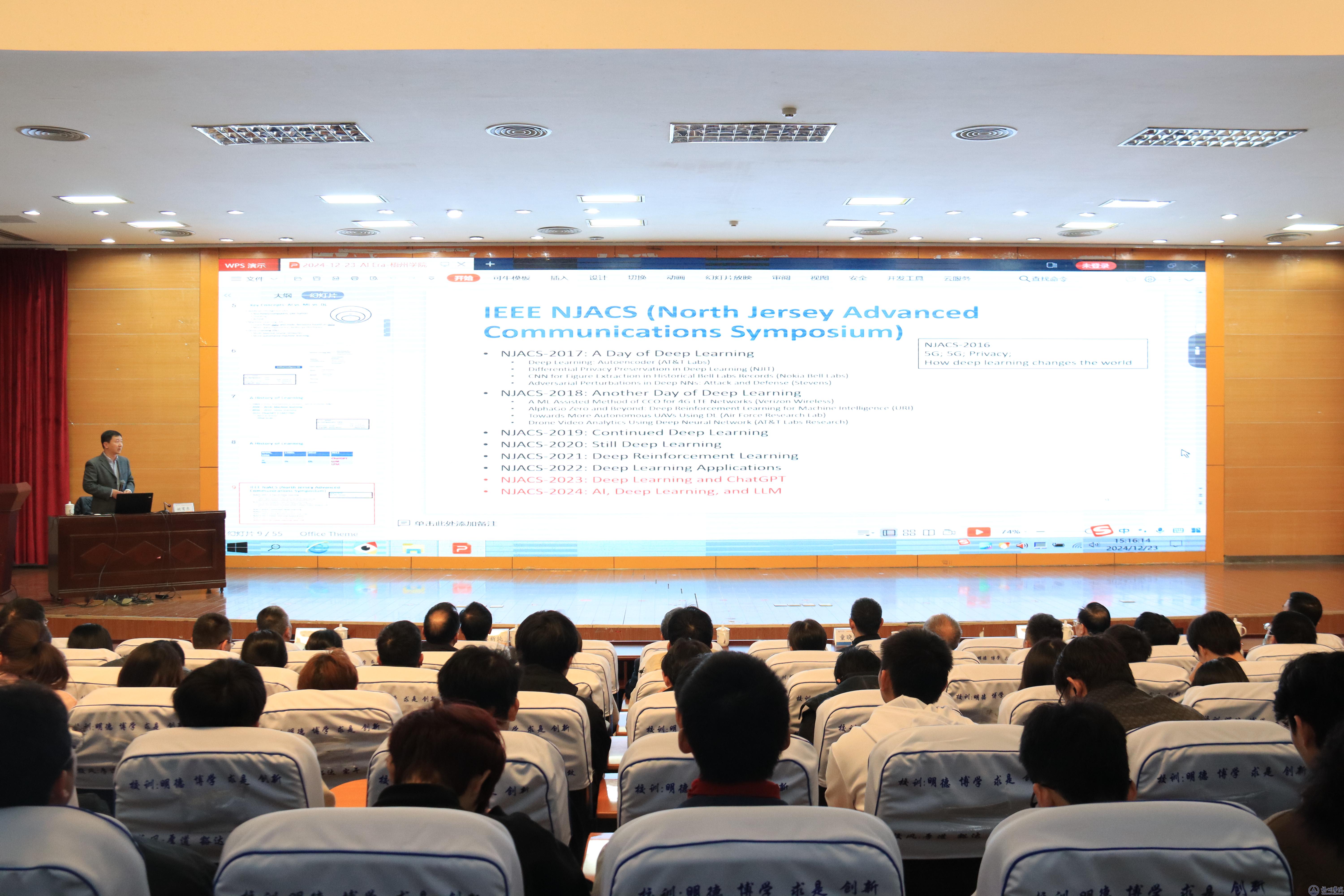 姚育东以《我们在人工智能时代:学习,工作,研究》为题开讲,介绍了人工智能的发展历程,从早期概念到机器学习、深度学习再到大模型时代,阐述了各阶段的技术特点与应用。如2016 年 AlphaGo 击败世界冠军掀起深度学习热潮,近两年ChatGPT带来新变革,技术迭代迅速。他还分享人工智能广泛应用于医疗(疾病诊断、影像分析)、交通(无人驾驶)、教育(辅助学习)等领域,如在医疗健康中,能助力病症识别与疾病预测;教育领域可作为智能辅导工具,改变传统教学与学习模式。他还就学生如何学习人工智能给出建议,对于人类是否会被AI替代这一话题,他提出“使用AI的人将会替代不使用AI的人”的看法。他认为大学生要重视数学,掌握编程(Python 等)等基础知识,通过项目实践、校企合作、参与竞赛等主动学习,利用网络资源提升个人技能,注重文献综述与实验操作,培养创新能力与团队协作精神。
