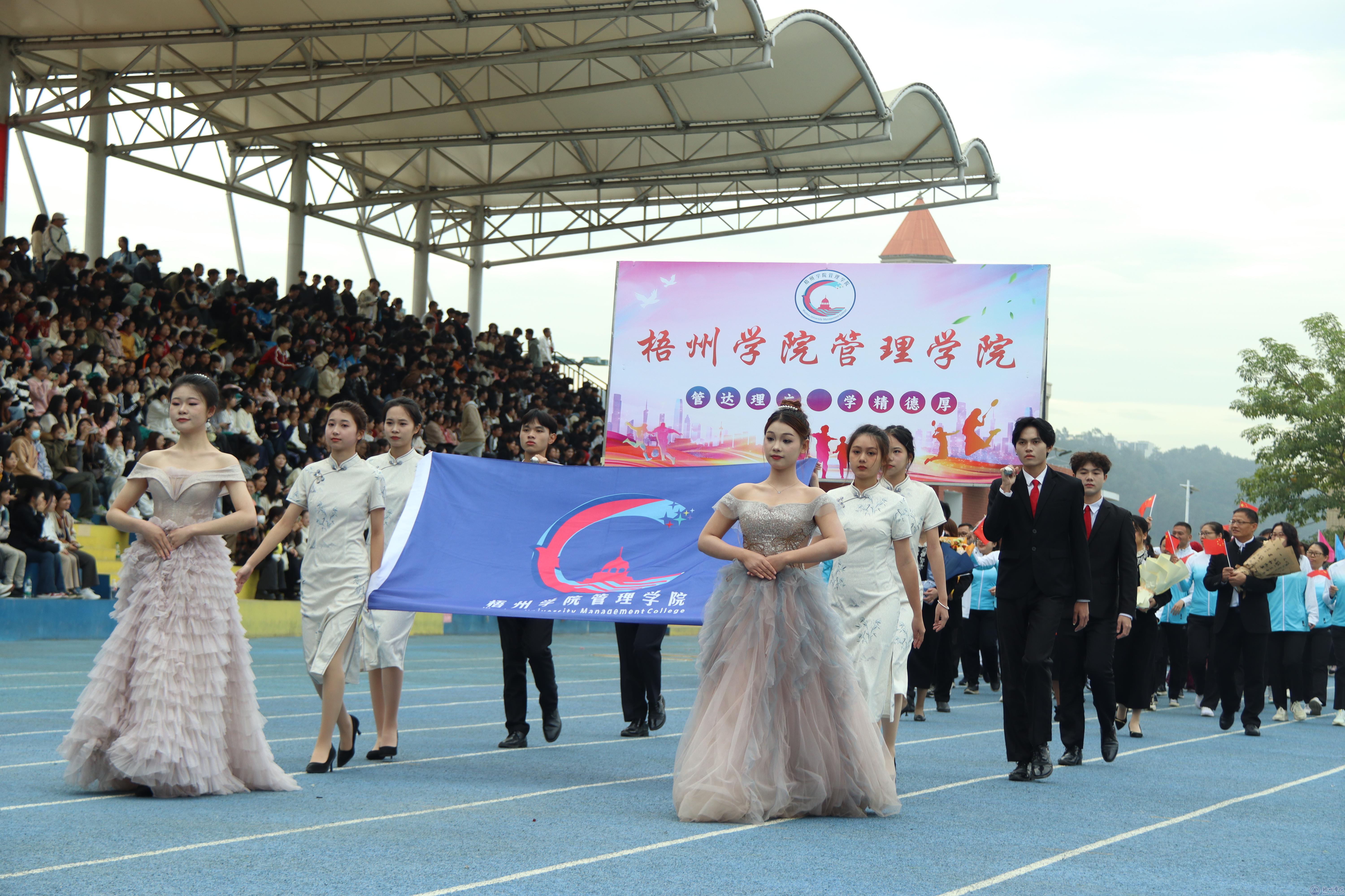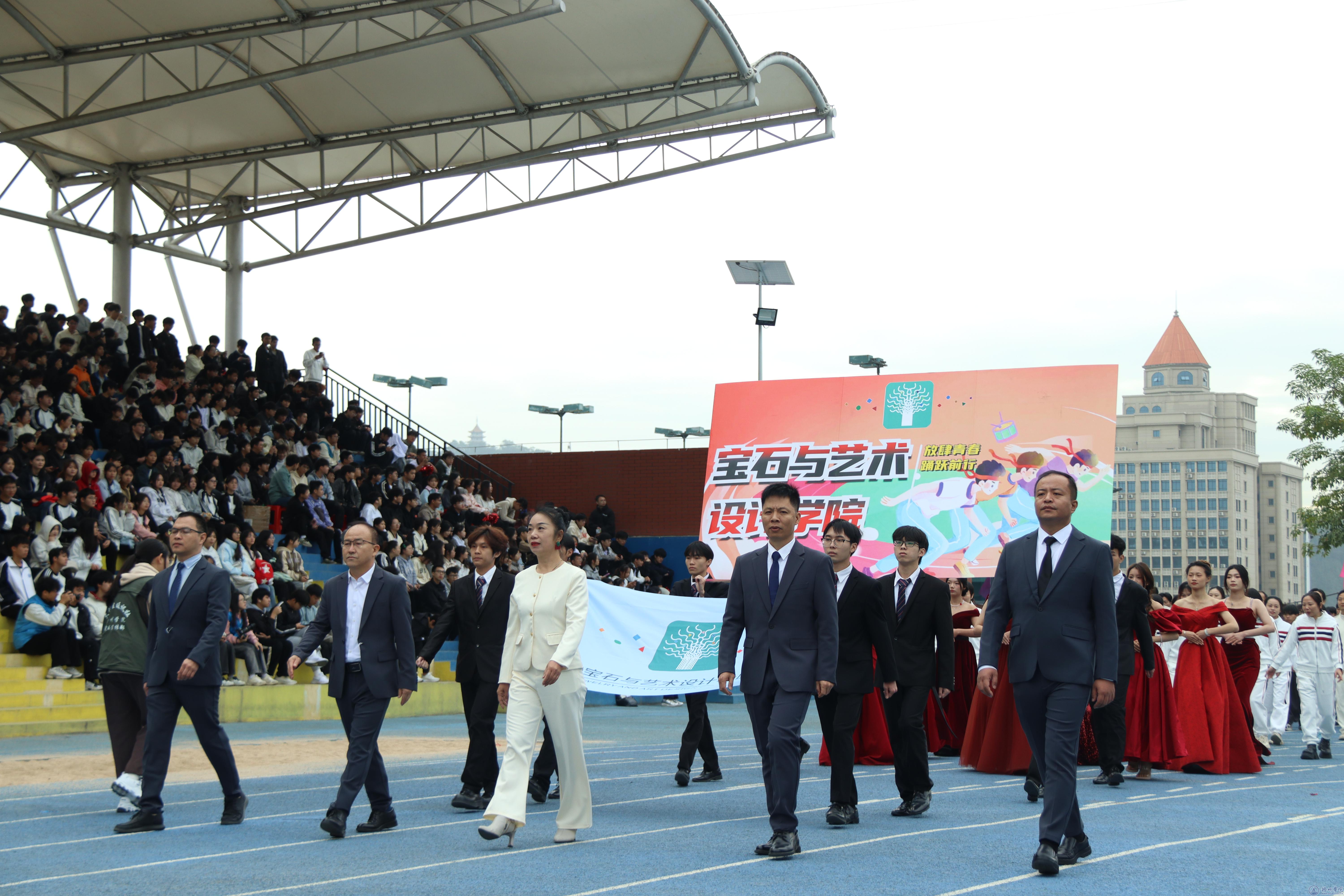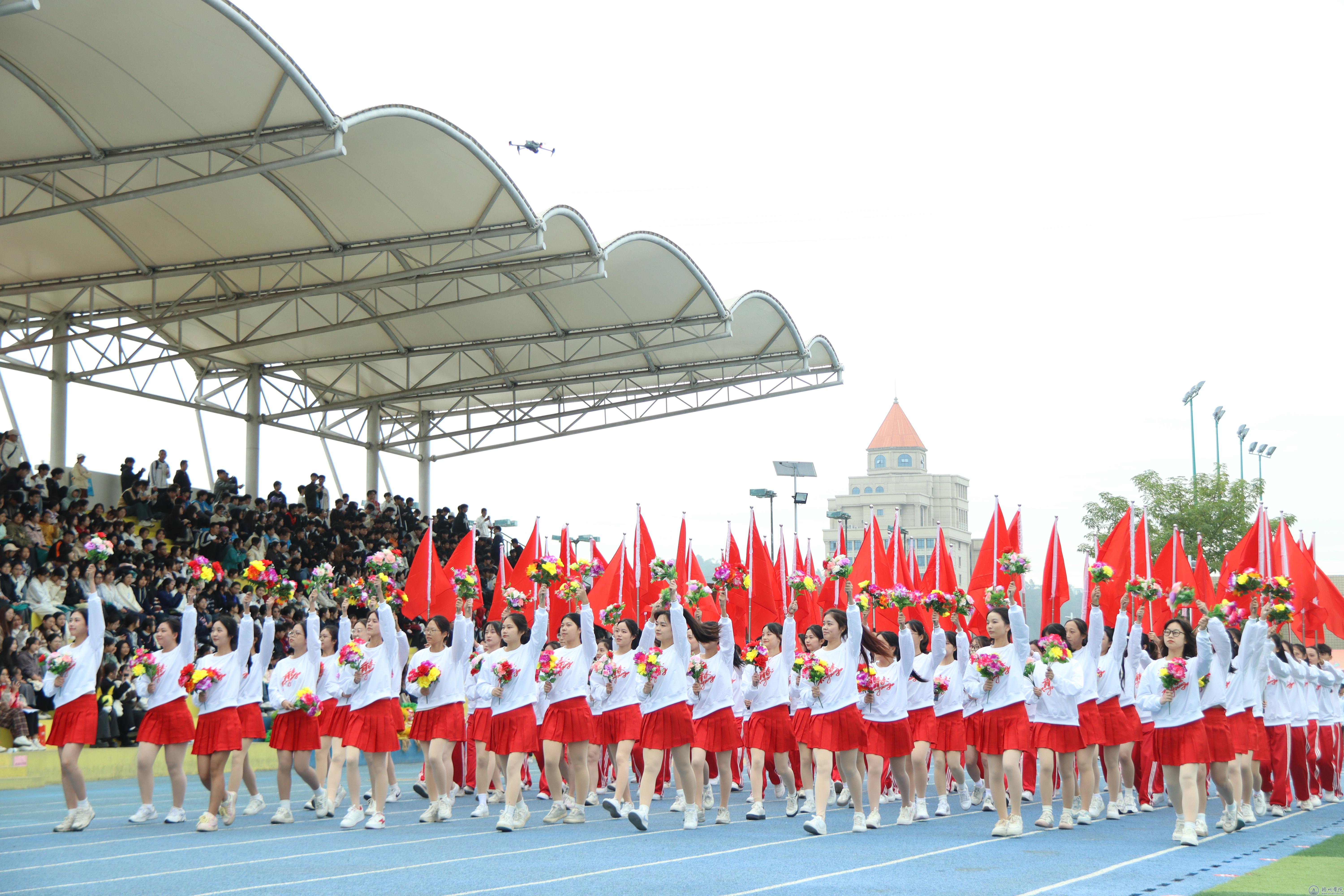 田径场上,彩旗飘扬,气氛热烈。伴随雄壮激昂的音乐,国旗、校旗、会旗方队,会牌、字牌方队,红旗、鲜花方队,各二级学院方队,机关教职工方队,裁判员方队,管乐队方队依次入场,他们迈着矫健的步伐,口号激昂,动作整齐划一。