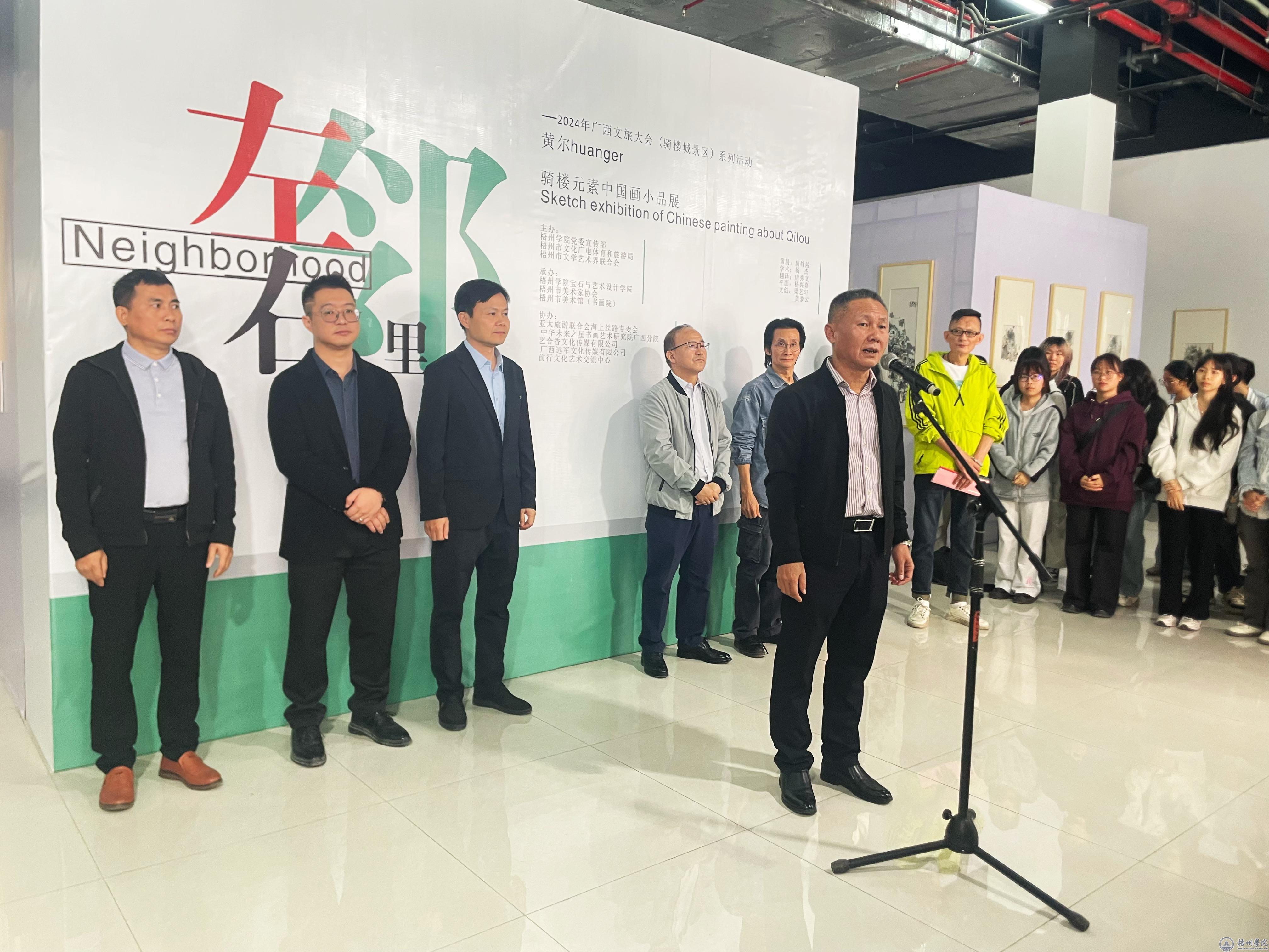 揭幕式上,潘彤、杨杰先后为本次展览致辞。潘彤指出,黄尔老师的作品皆围绕梧州市骑楼城元素创作,且在广西文旅大会上展出,对梧州历史文化及骑楼城宣传有着极佳的效果。杨杰指出,本次展览的作品进一步丰富了梧州市商贸文化、岭南文化的内涵,以独特的艺术视角展现了梧州文化的多元性与独特魅力,让市民和游客能从这些作品中领略梧州深厚的文化底蕴,为梧州文化艺术的发展注入了新的活力。
