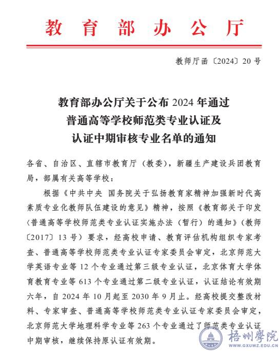 近日,教育部办公厅发布《关于公布2024年通过普通高等学校师范类专业认证及认证中期审核专业名单的通知》(教师厅函 〔2024〕20号),我校小学教育专业通过普通高等学校师范类专业第二级专业认证中期审核,继续保持原有效期至2027年8月。