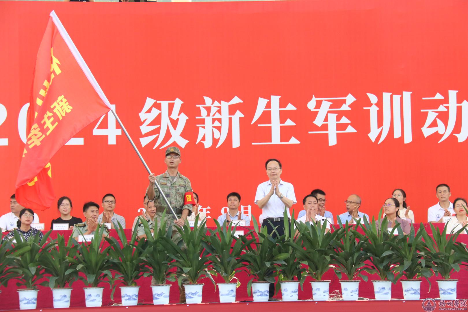 学校党委副书记梁业华为新生军训团授“梧州学院新生军训团团旗”。