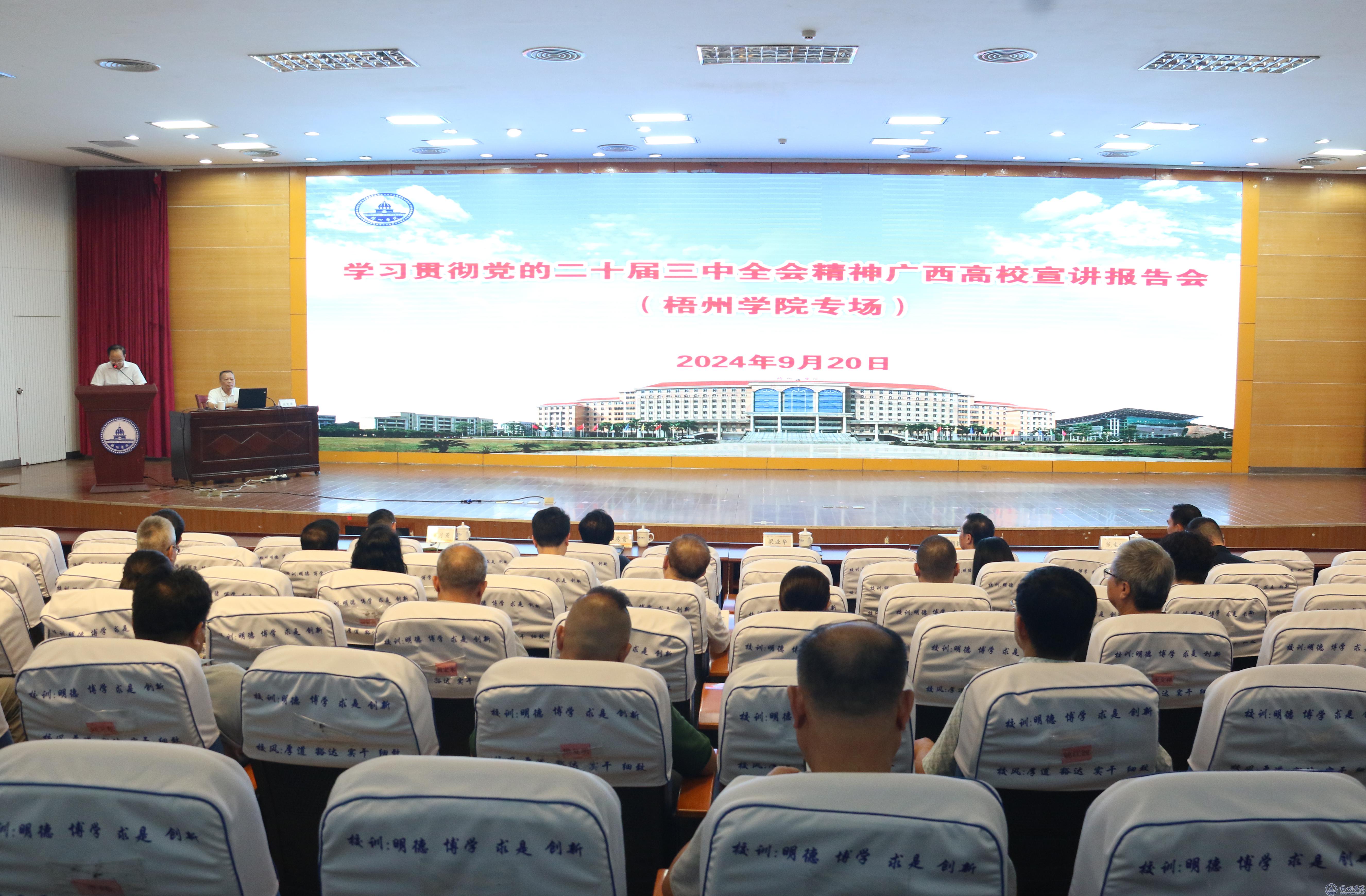 9月20日下午,学习贯彻党的二十届三中全会精神广西高校宣讲报告会在我校明理楼一楼学术报告厅举行。自治区党委讲师团特聘教授(专家)、百色学院党委副书记徐魁峰教授作宣讲报告。全体在家校领导,全体中层干部、全体思想政治理论课专职教师、各二级党委下设党支部书记、全体辅导员和学生代表参加报告会。报告会由学校党委副书记梁业华主持。