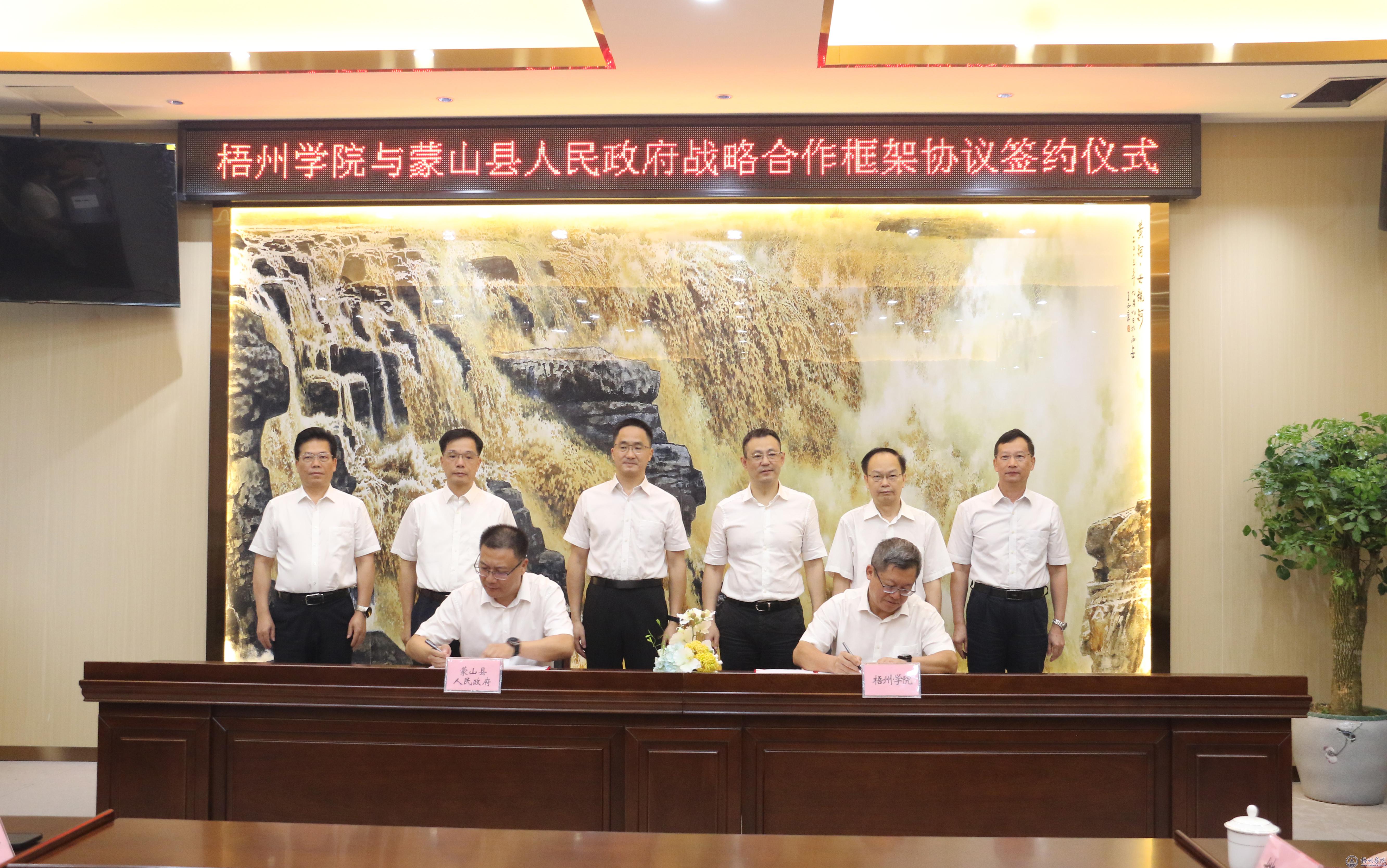 在与会人员的共同见证下,梧州学院校长杨奔、蒙山县县长陈坚分别代表梧州学院、蒙山县人民政府签署了战略合作框架协议。
