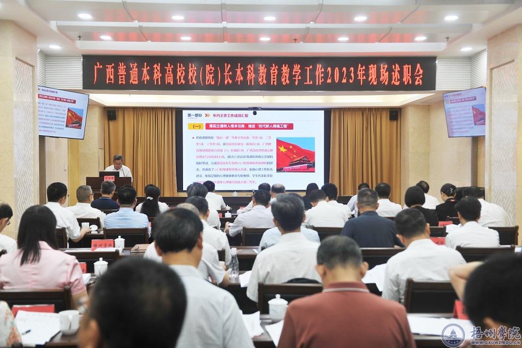 6月28日,根据自治区教育厅统一安排,杨奔校长到自治区教育厅参加广西本科高校校(院)长本科教育教学工作2023年现场述职会。杨奔校长围绕立德树人情况、重视本科教育情况、本科教育改革创新情况、本科教学条件保障情况、师资队伍建设情况、本科教育评价激励情况和本科教育工作成效等开展现场述职,分析了相关工作的主要成效、遇到的问题以及下一步改进计划。广西大学等6所本科高校校(院)长先后在现场作了述职。