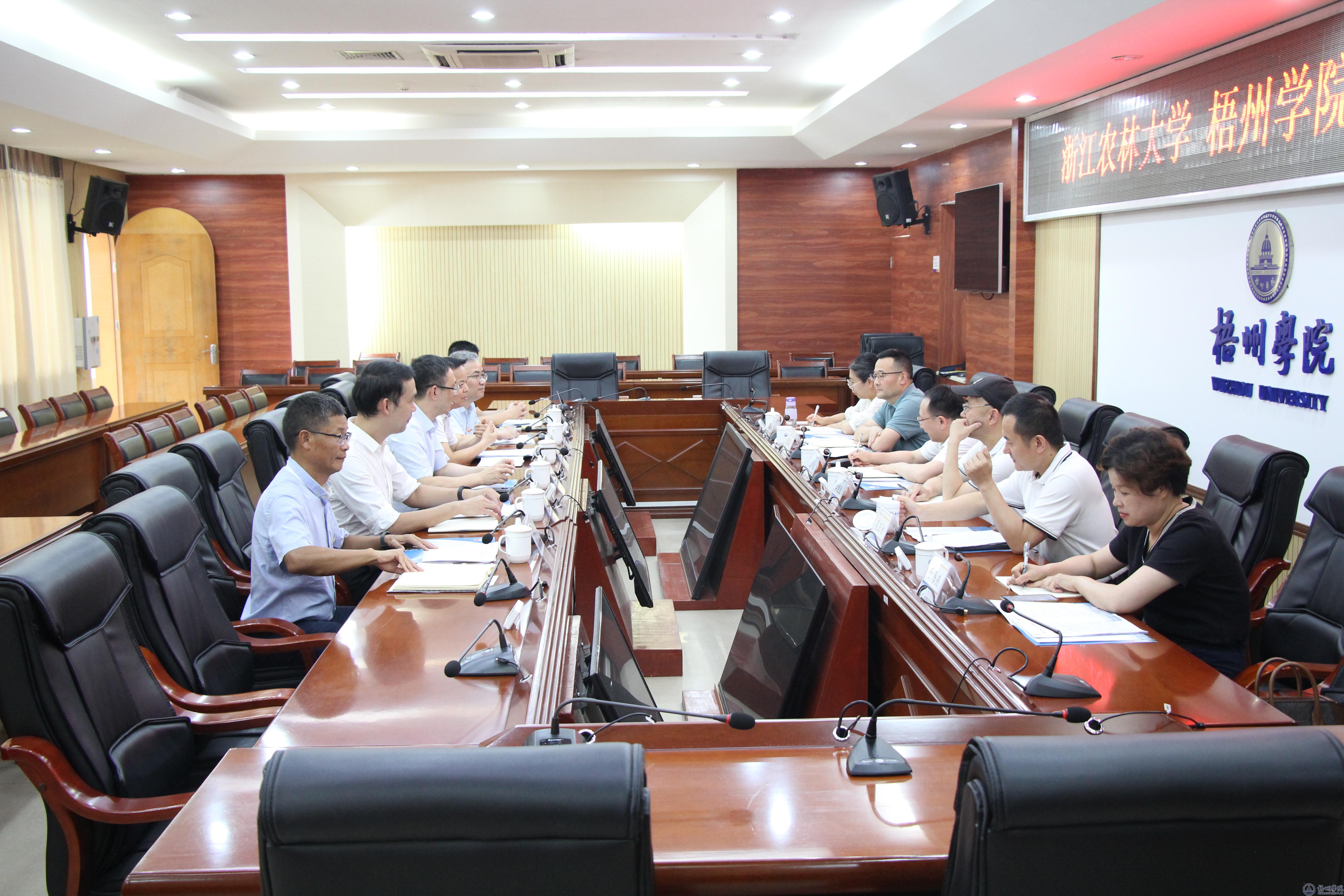 童晓晖对包松永一行的到来表示热烈欢迎,并介绍了我校的历史沿革、教学科研、人才产出和办学效益等基本情况。他指出,浙江农林大学的前身是浙江林学院,是自己曾经工作过的地方,学校实现跨越式发展、成功更名为浙江农林大学之前的情况,与现阶段梧州学院非常相似,其很多成功的经验和做法值得我们学习借鉴。他强调,作为学校党风廉政建设第一责任人,要认真履行职责,切实抓好党委主体责任的落实,把反腐倡廉建设放在党委工作更加突出的位置;学校各级党组织要加强党员干部、教职工的教育管理监督,综合运用监督执纪“四种形态”,特别是要用好“第一种形态”,对一些苗头性、倾向性的党员干部及时“红脸出汗”“咬耳扯袖”,防止小错演变成大错;要加强制度建设,依章依规依纪办事,从源头上建立健全防范廉洁风险机制;要加强人才队伍建设,把建设高素质创新型教师队伍作为学校发展的重中之重,在规范中创新,在创新中发展,为学校教育事业高质量发展提供有力的人才支撑。