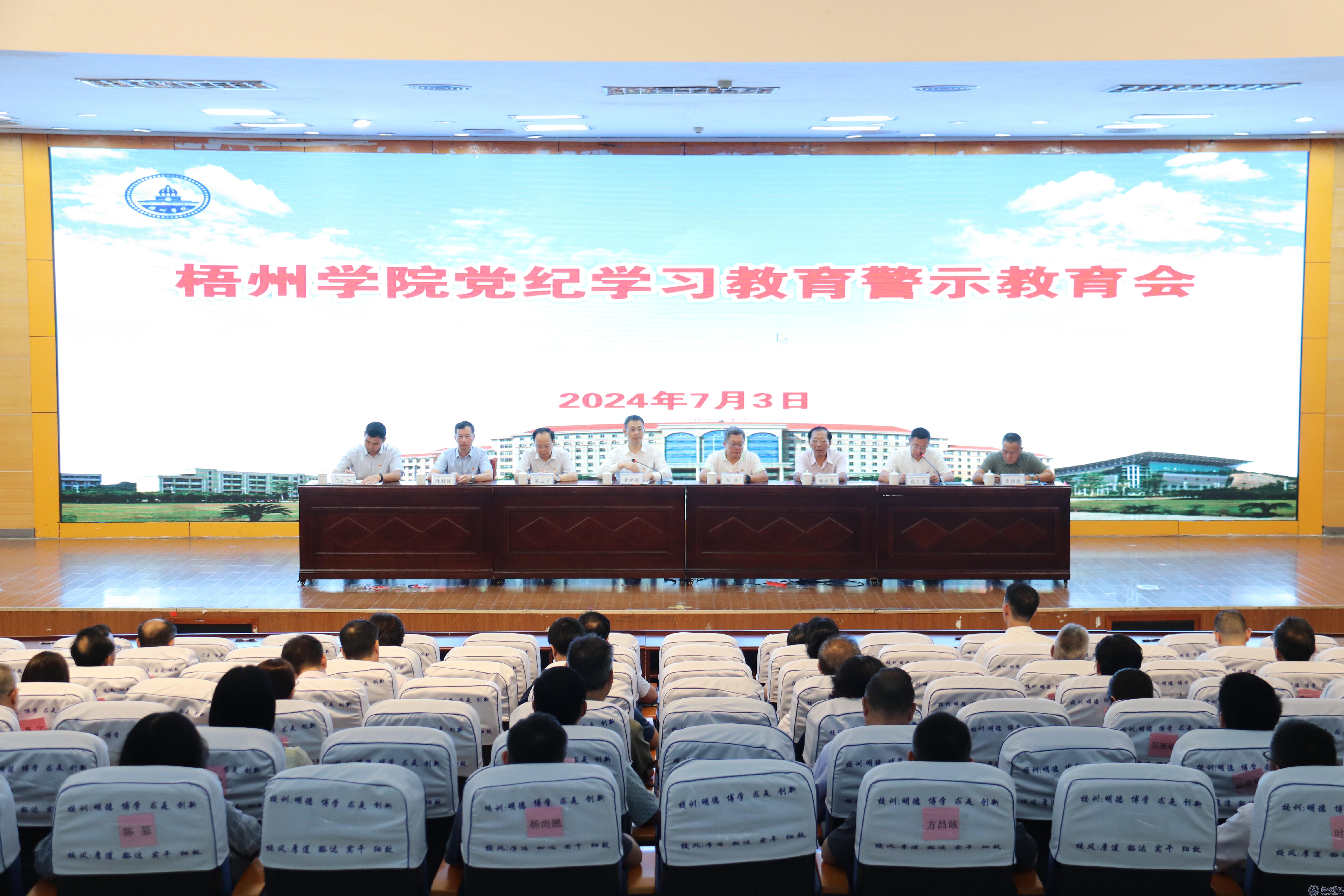 根据党中央、自治区党委关于开展党纪学习教育的部署要求和学校党委党纪学习教育的工作安排,7月3日,我校在明理楼一楼报告厅召开警示教育会。学校领导童晓晖、杨奔、梁业华、邱房贵、麻新纯、宾月景、范生汝、覃雄彪出席。校党委书记童晓晖主持会议。