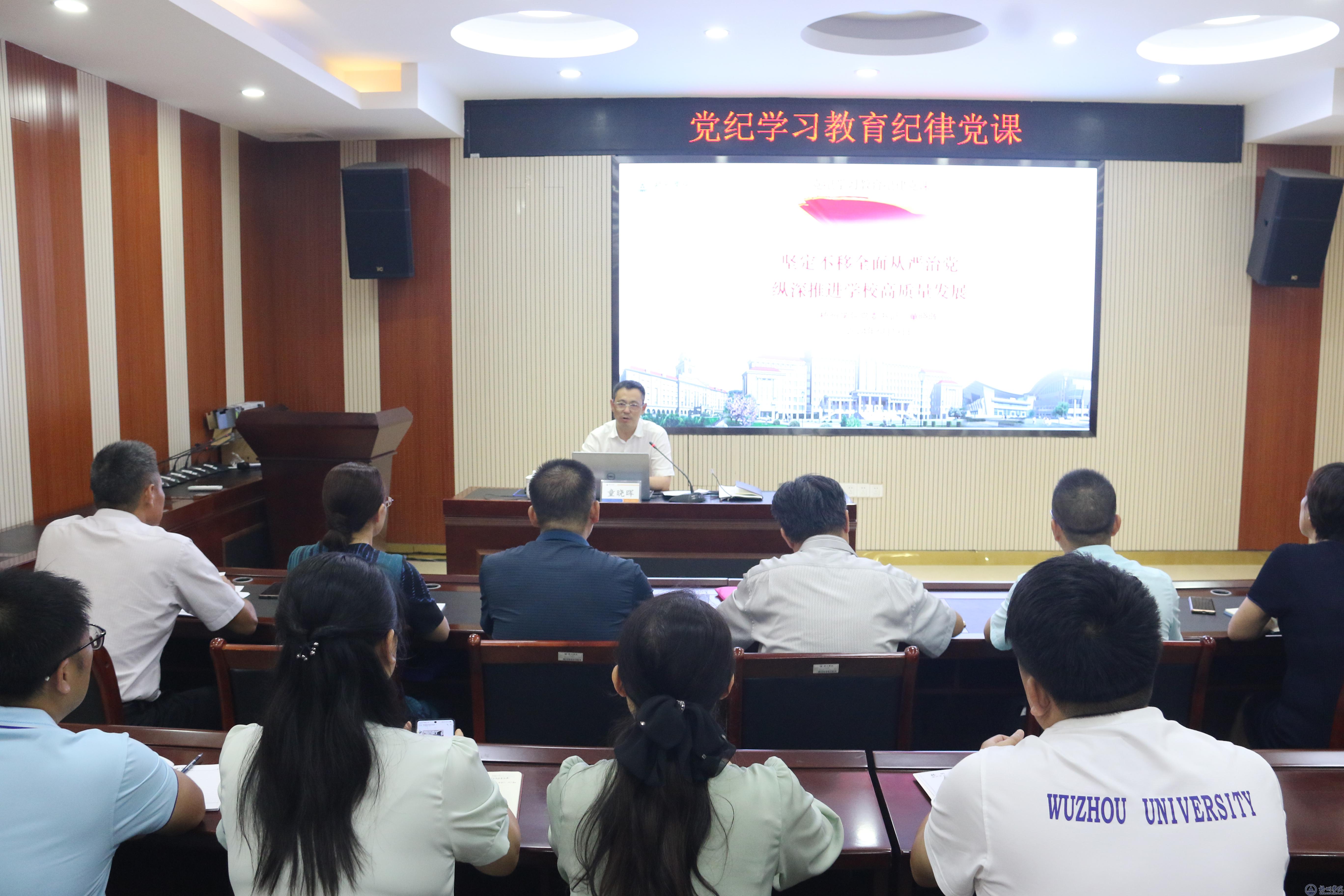 6月19日下午,学校在明理楼七楼视频会议室举办党纪学习教育纪律党课,校党委书记童晓晖以《坚定不移全面从严治党纵深推进学校高质量发展》为题,为全校基层党务干部讲授纪律党课。