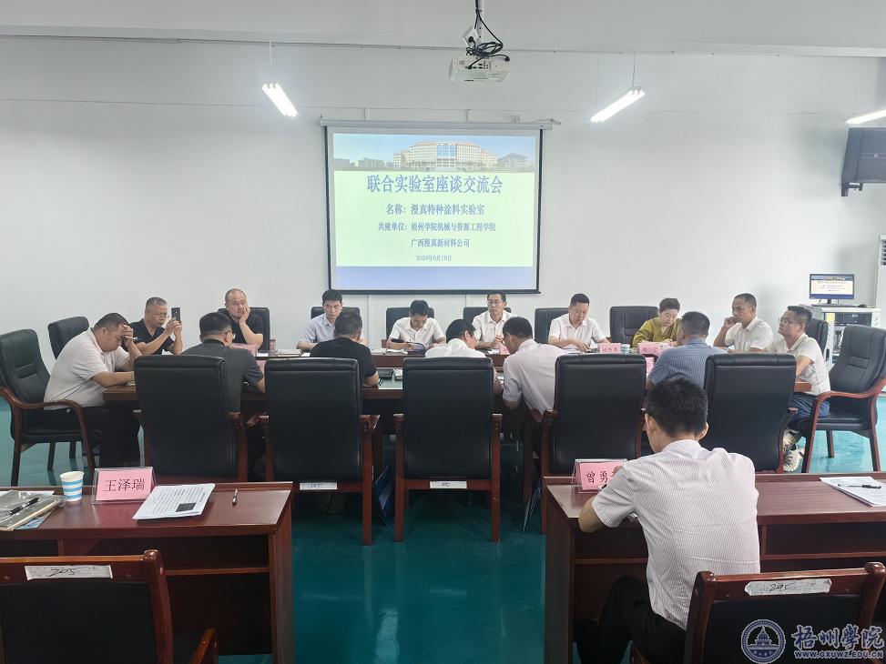 6月18日上午,我校机械与资源工程学院与广西漫真新材料有限公司联合实验室共建工作会议和座谈交流会议在北校区机械与资源工程学院会议室举行。自治区工商联副主席宾建光、会员部副部长洪青松等一行10人,学校纪委书记宾月景、机械与资源工程学院院长钟山、副院长王卫东及师生代表出席本次会议。