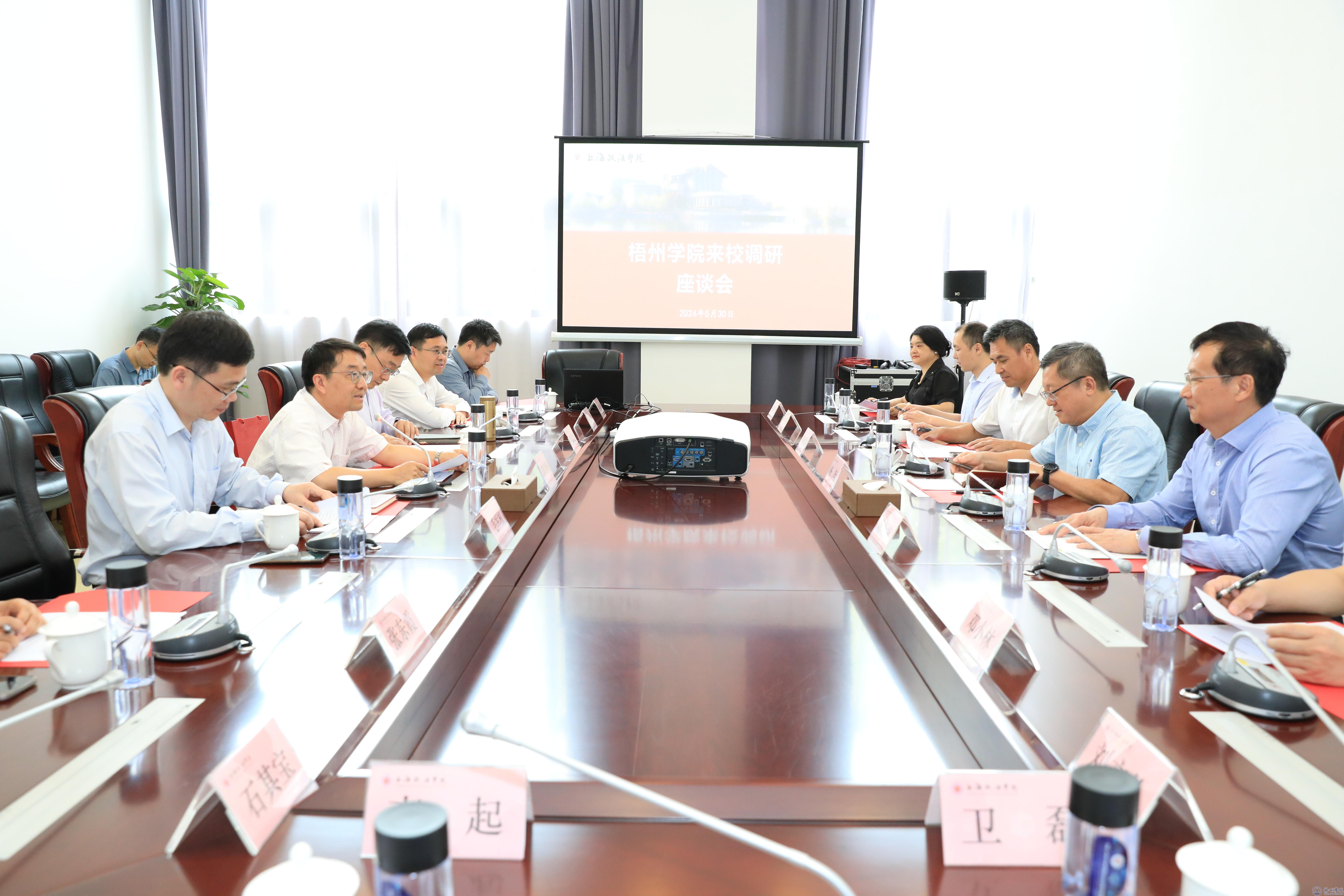 在上海政法学院召开的座谈会上,葛卫华书记全面介绍了上海政法学院的发展历史、教学科研、国际合作与交流以及中国—上合司法培训基地等方面的情况。杨奔校长对上海政法学院的热情接待表示感谢,对上海政法学院40年的跨越式发展和取得的成就表示赞赏。他介绍了梧州学院的基本情况,表示上海政法学院与梧州学院在发展历史、办学定位等诸多方面有相似之处,希望两校能够进一步加强沟通联系,扩展校际合作,相互支持,共同发展。双方围绕本科教学综合评估、一流学科专业建设、硕点培育与申报、内部管理综合改革等工作进行了深入交流。