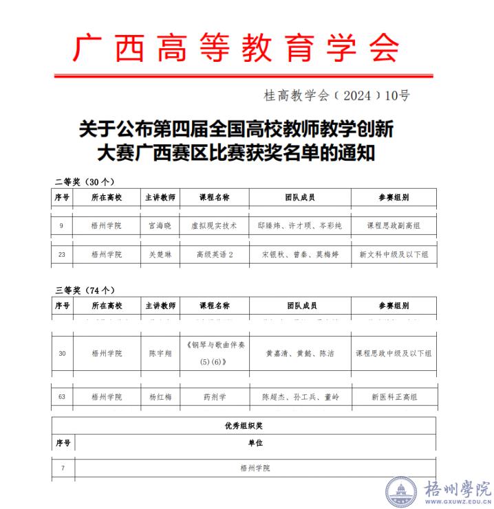 第四届全国高校教师教学创新大赛广西赛区现场决赛4月20日至21日在广西大学举行。本次比赛共有全区39所本科高校超过700名教师参加比赛,119名教师进入区赛现场决赛。我校有4名教师通过网络评审选拔进入现场决赛。