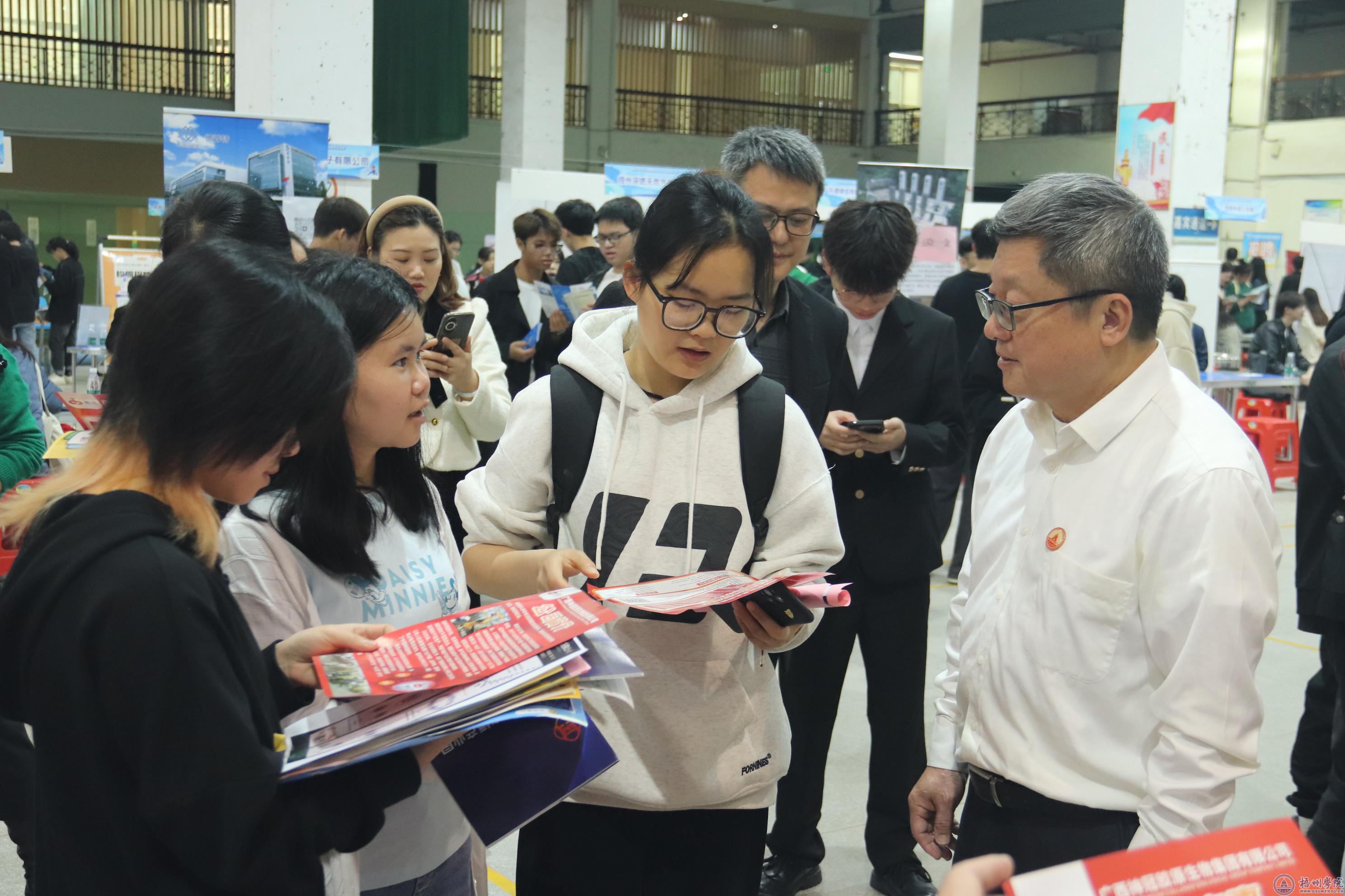 校长杨奔在学生工作部(处)相关负责人陪同下,深入双选会现场,走访企业招聘展位,与用人单位及毕业生进行亲切交流,详细了解招聘单位的专业需求、岗位需求、薪资待遇等情况,并与应聘毕业生面对面沟通求职意向和应聘情况,积极向用人单位推介我校毕业生。
