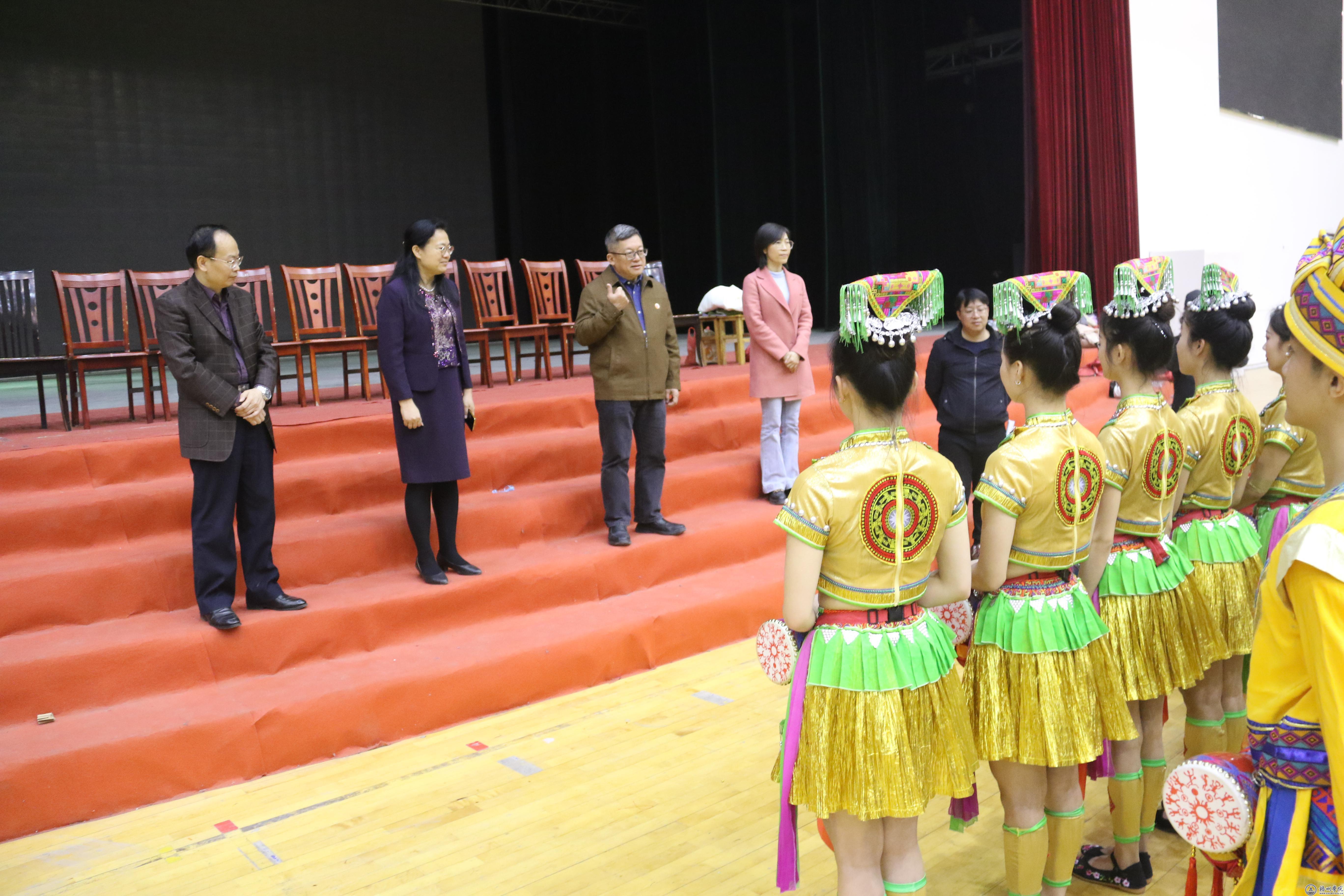 1月16日,学校领导韦仕珍、杨奔、梁业华、莫晨宇在体育馆三楼看望慰问即将赴香港参加香港“2024国泰新春国际汇演之夜”活动的师生。学校领导观看了师生们排练的舞蹈《唱山歌》,对节目效果表示肯定。