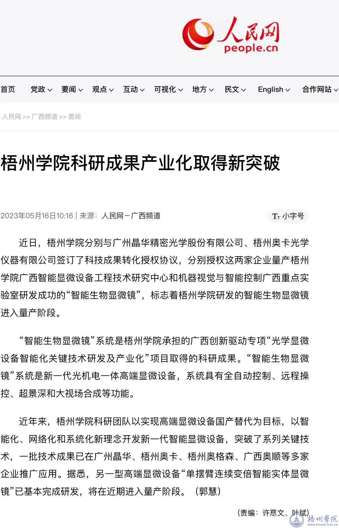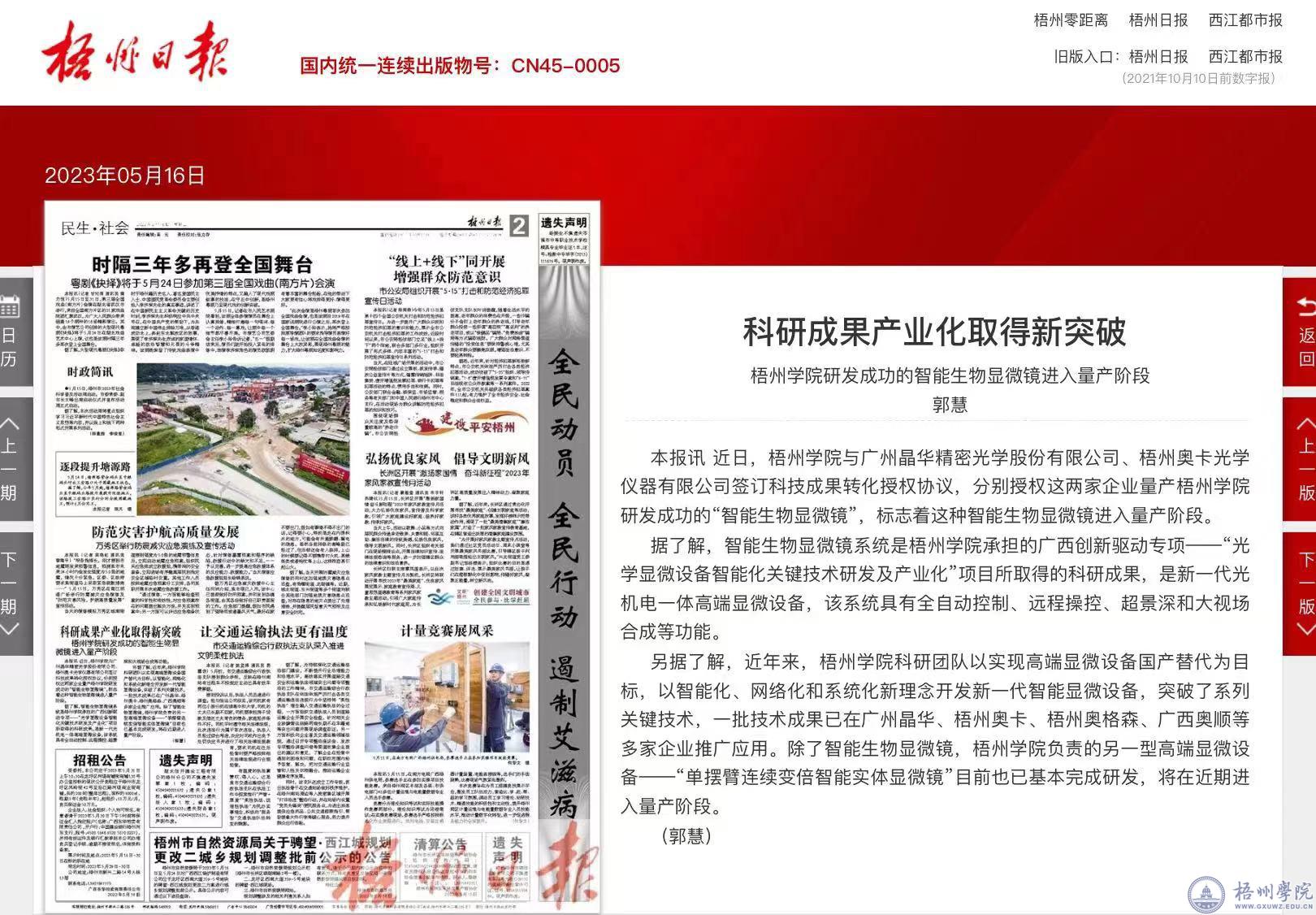2023年梧州学院分别与广州晶华精密光学股份有限公司、梧州奥卡光学仪器有限公司签订了科技成果转化授权协议,分别授权这两家企业量产我校广西智能显微设备工程技术研究中心和机器视觉与智能控制广西重点实验室研发成功的“智能生物显微镜”,标志着我校研发的智能生物显微镜进入量产阶段。另一型高端显微设备“单摆臂连续变倍智能实体显微镜”已基本完成研发,即将进入量产阶段。这一新闻得到人民网、梧州日报等媒体报道。