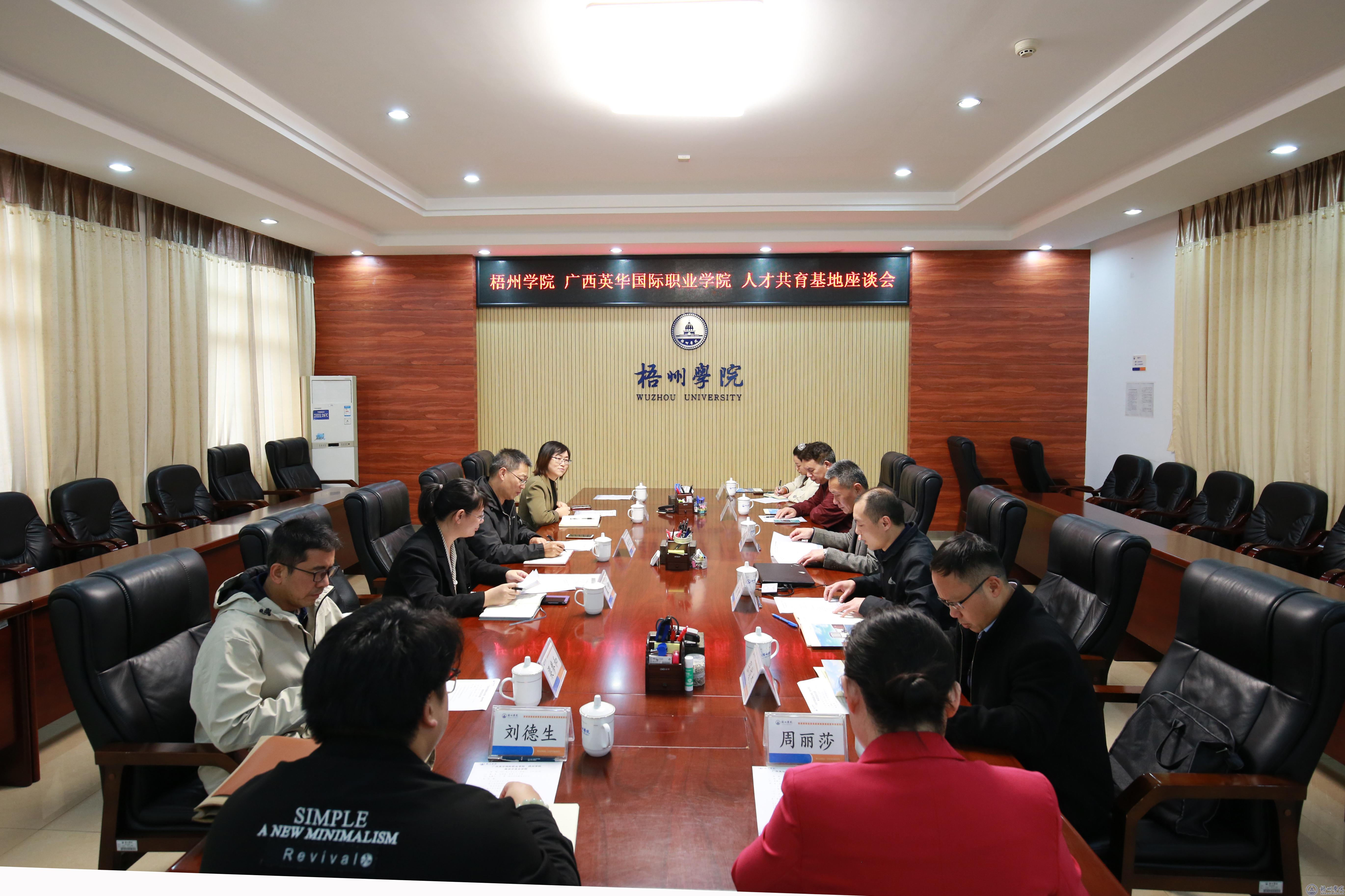 双方在明理楼八楼第二会议室座谈交流。覃雄彪介绍了我校的办学历史沿革、办学定位、学科特色、人才培养、服务地方等方面的情况,他表示广西英华国际职业学院在产教融合等方面很有特色,希望两校加强沟通与交流,携手并肩,共同推动两校高质量发展。黄家良介绍了广西英华国际职业学院办学历史、学校管理、专业建设等方面的概况,希望以此次交流为契机,在毕业生就业创业、学生升学、教师学历提升等方面加强沟通与交流,建立密切合作关系,推动两校合作共赢。