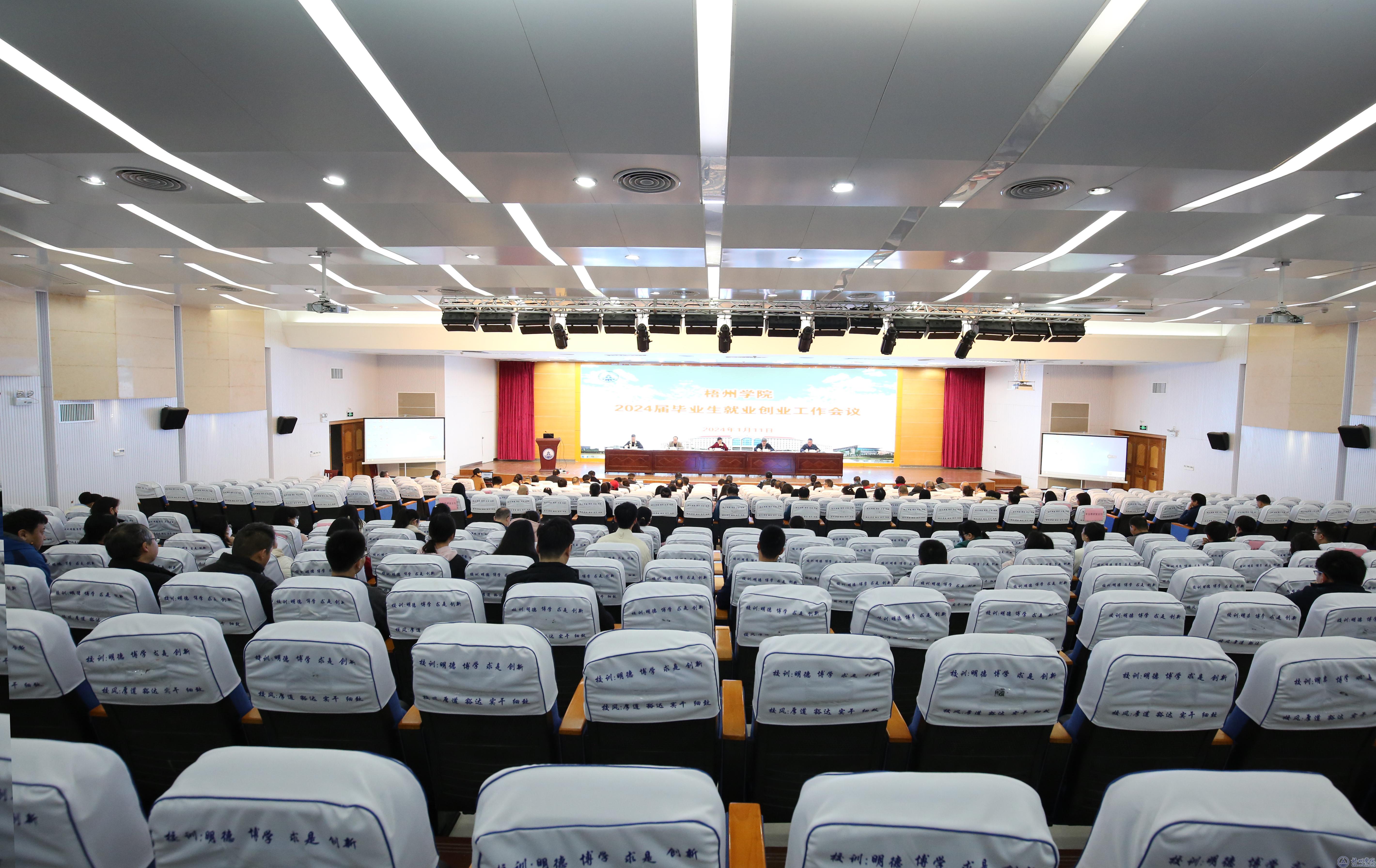 为认真落实党中央和自治区党委、政府关于高校毕业生就业创业工作的决策部署,高质量完成就业工作目标,1月11日上午,学校在明理楼一楼学术报告厅召开2024届毕业生就业创业工作会议,回顾总结2023届毕业生就业创业工作,分析形势,部署2024届毕业生就业创业工作。学校党委书记韦仕珍、校长杨奔、党委副书记梁业华,梧州市人力资源和社会保障局副局长徐斌出席会议。会议由副校长覃雄彪主持。