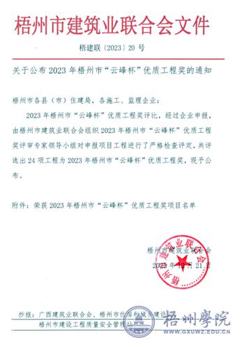 近日,梧州市建筑业联合会举办了2023年建设工程“云峰杯”优质工程奖评选活动。经评委会专家进行资料审查和现场复查,我校北片区项目(1#综合职业实验实训楼、1#阶梯教室和1#综合教学楼)工程,荣获2023年梧州市“云峰杯”优质工程奖。