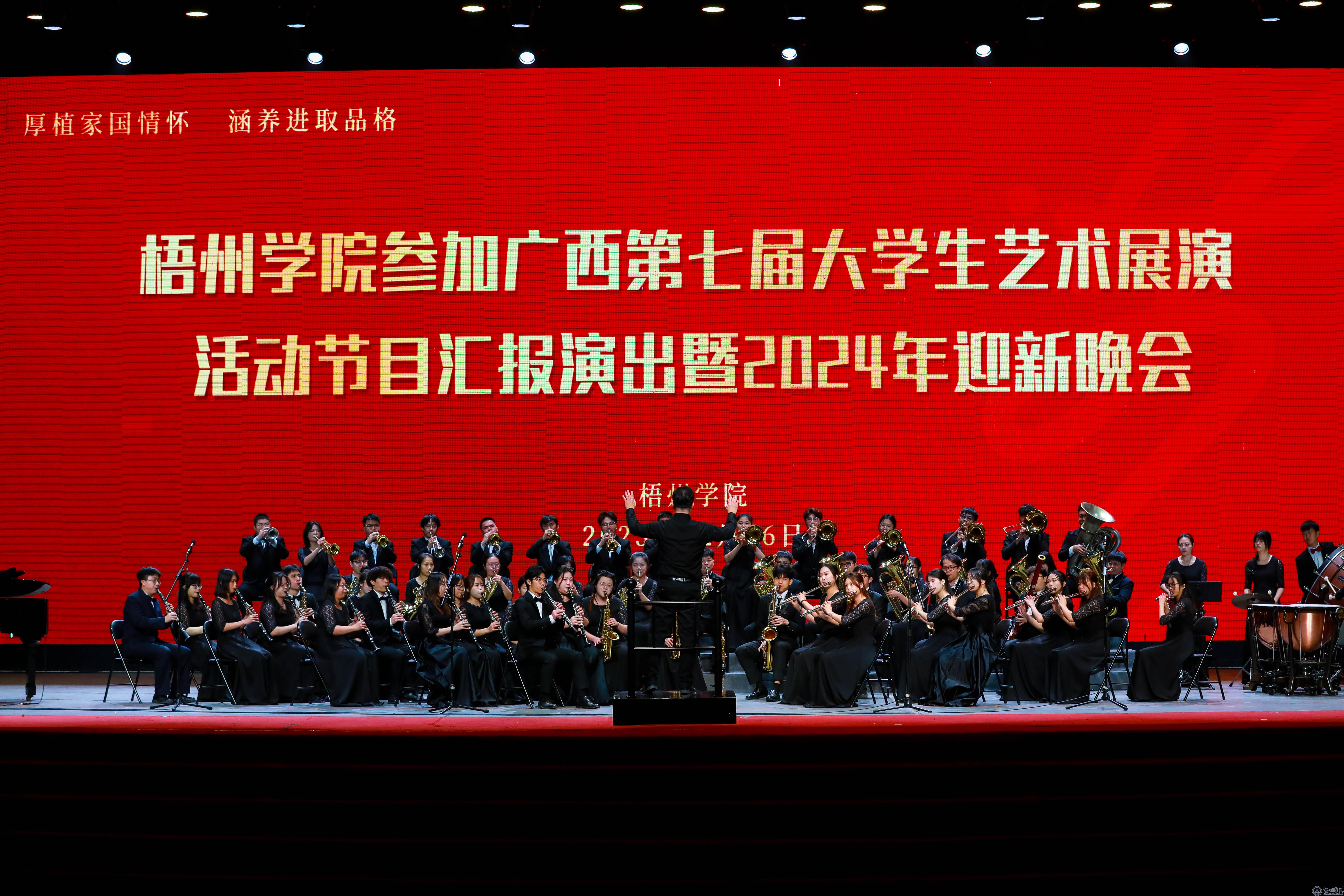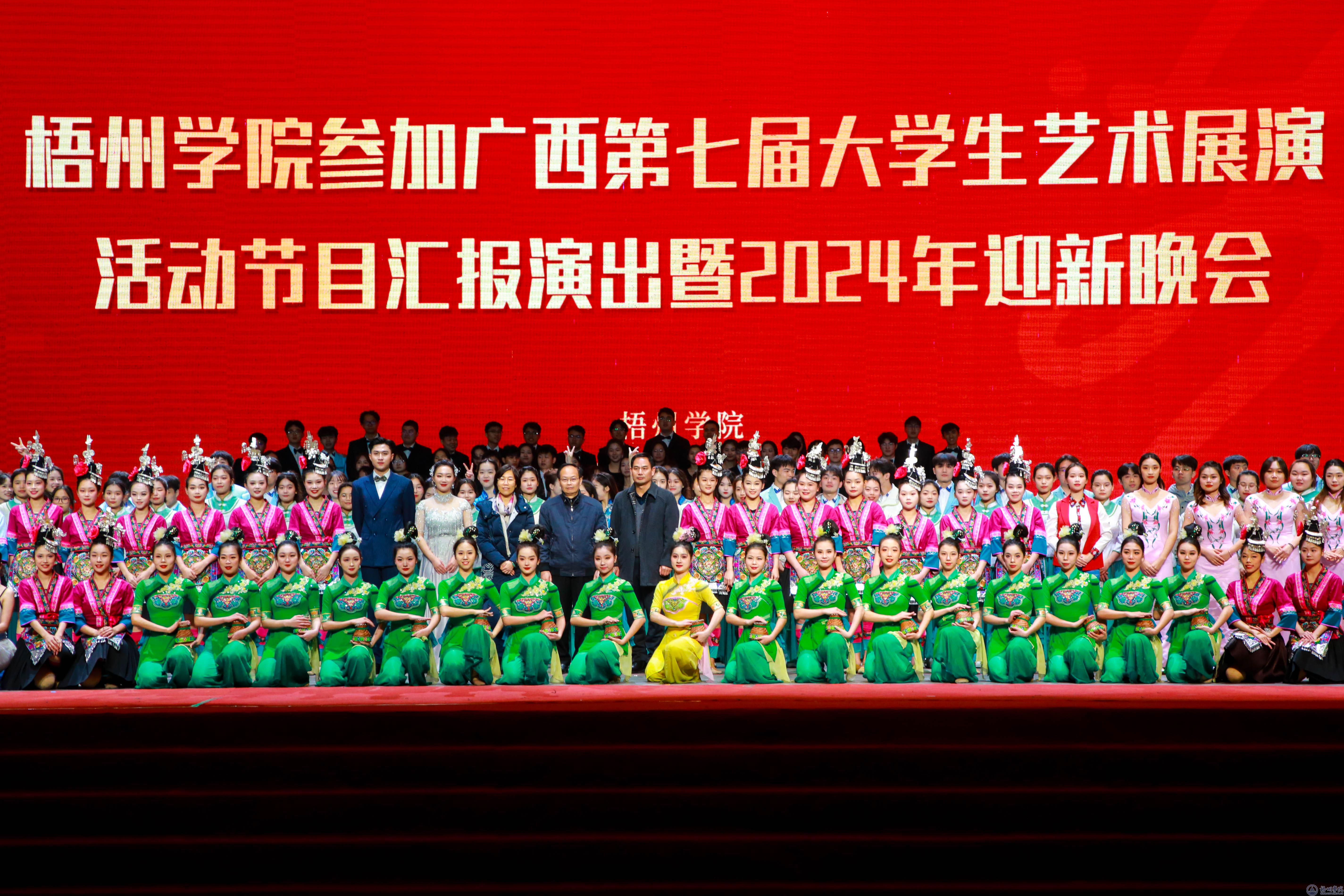 为丰富校园文化生活,展示我校美育工作成果,激励广大师生在新的一年以更饱满的热情投入到工作和学习中,12月26日晚,我校在体育馆三楼举办广西第七届大学生艺术展演活动参演节目汇报演出暨2024年迎新晚会,晚会以“厚植家国情怀,涵养进取品格”为主题。学校党委副书记梁业华、副校长范生汝、副校长莫晨宇出席活动,来自学校各单位、各部门负责人,二级学院分管学生工作领导、团委负责人,教职员工、学生代表以及社会各界人士观看本次演出。