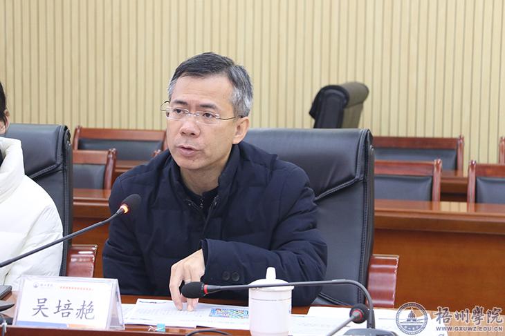 会上,梧州市博物馆馆长吴培赩以《历史溯源,文化铸魂,共筑民族团结示范城》为主题作了专题辅导。他阐述了粤语及其文化的发端与发展、梧州建城史、与梧州相关的三位历史名人及其事迹、四种名特产的文化元素、五件梧州博物馆的珍贵文物背后的文化等,深入考察了梧州视角文化要素,既体现了习近平文化思想的引领,也对习近平总书记视察广西重要讲话精神中关于巩固发展各族人民团结奋斗良好局面作出回应。
