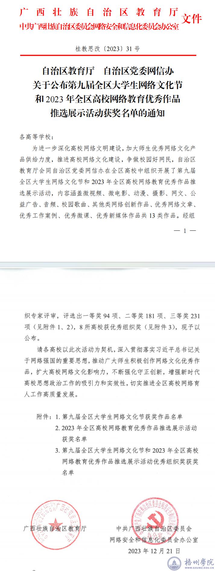 近日,根据《自治区教育厅自治区党委网信办关于公布第九届全区大学生网络文化节和2023年全区高校网络教育优秀作品推选展示活动获奖名单的通知》精神,在第九届全区大学生网络文化节中,由我校陈文老师指导,学生何艳林、黄慧琼、唐小薇、卢桂荣、李璐岑、邓橙申报的作品《退伍不褪色(女生版)》获微视频作品三等奖;由我校教师赵婉斐指导,学生罗婷婷申报的作品《平凡的一天》获摄影作品三等奖;由我校教师骆瀚文指导,学生韦秋巧申报的作品《茗有奇香,伴君永安》获网文作品三等奖;由我校教师蒙桂镔指导,学生张馨月、王春林、刘倩倩、宋福海申报的作品《“∞”》获公益广告平面广告类三等奖。