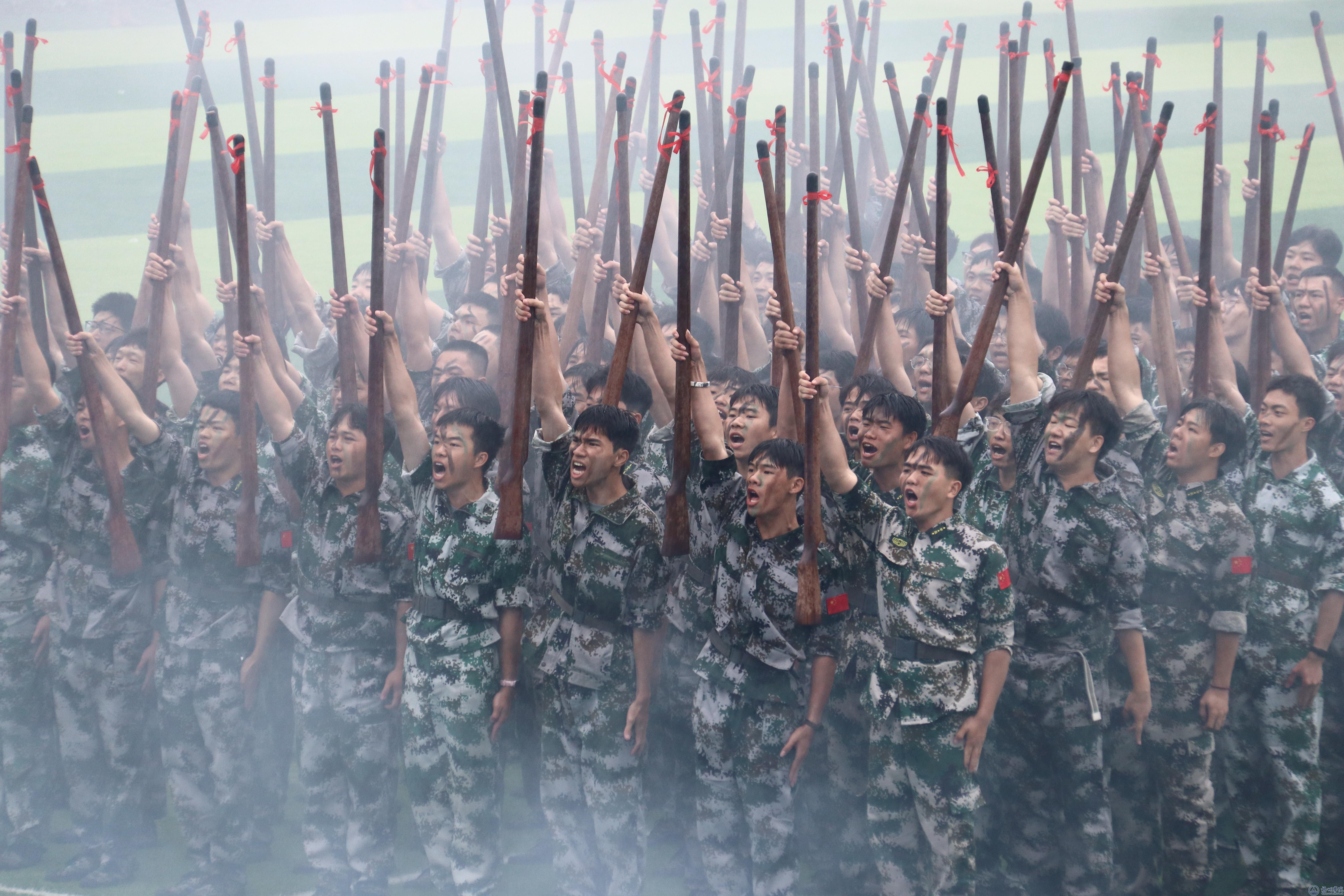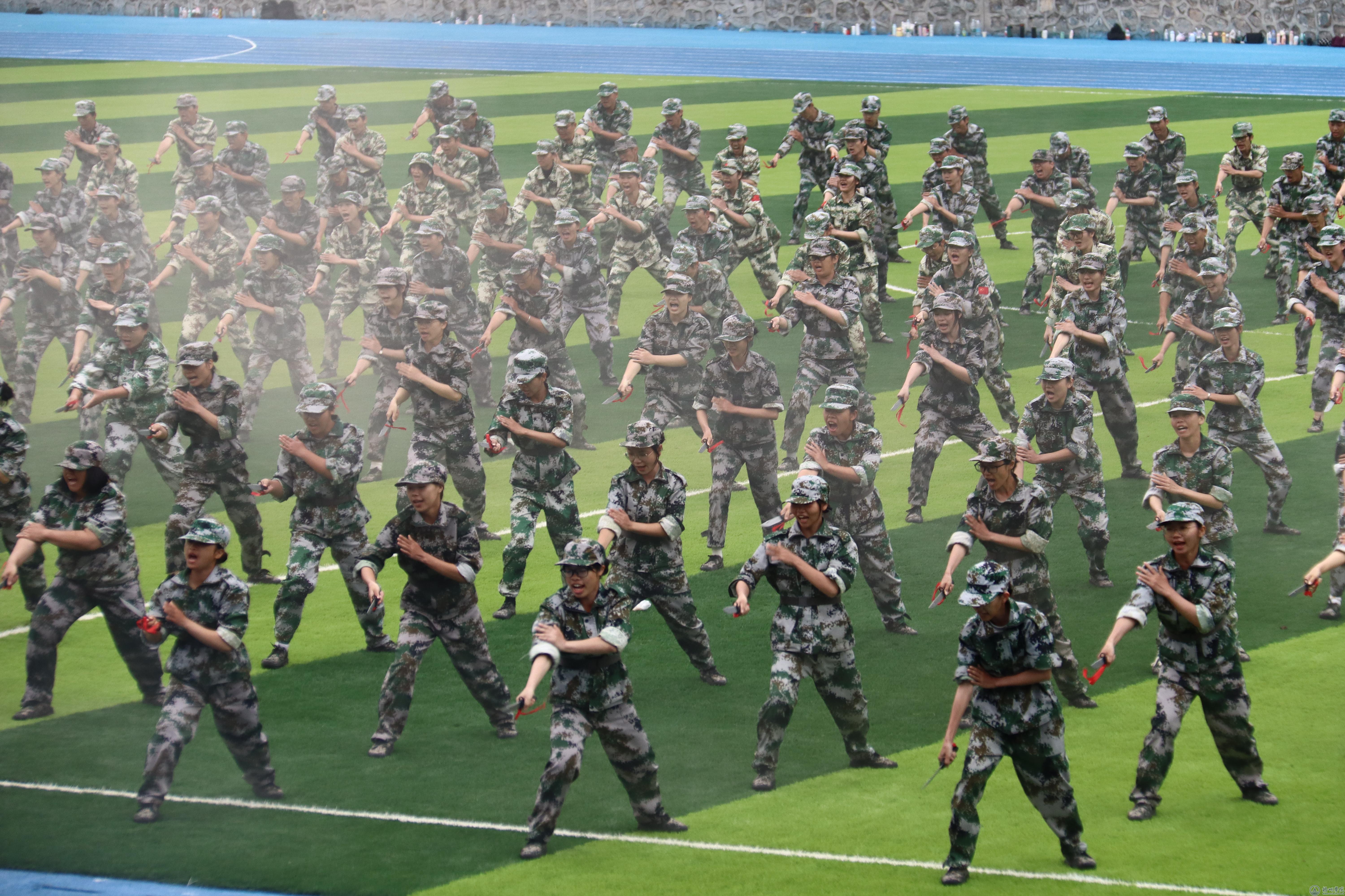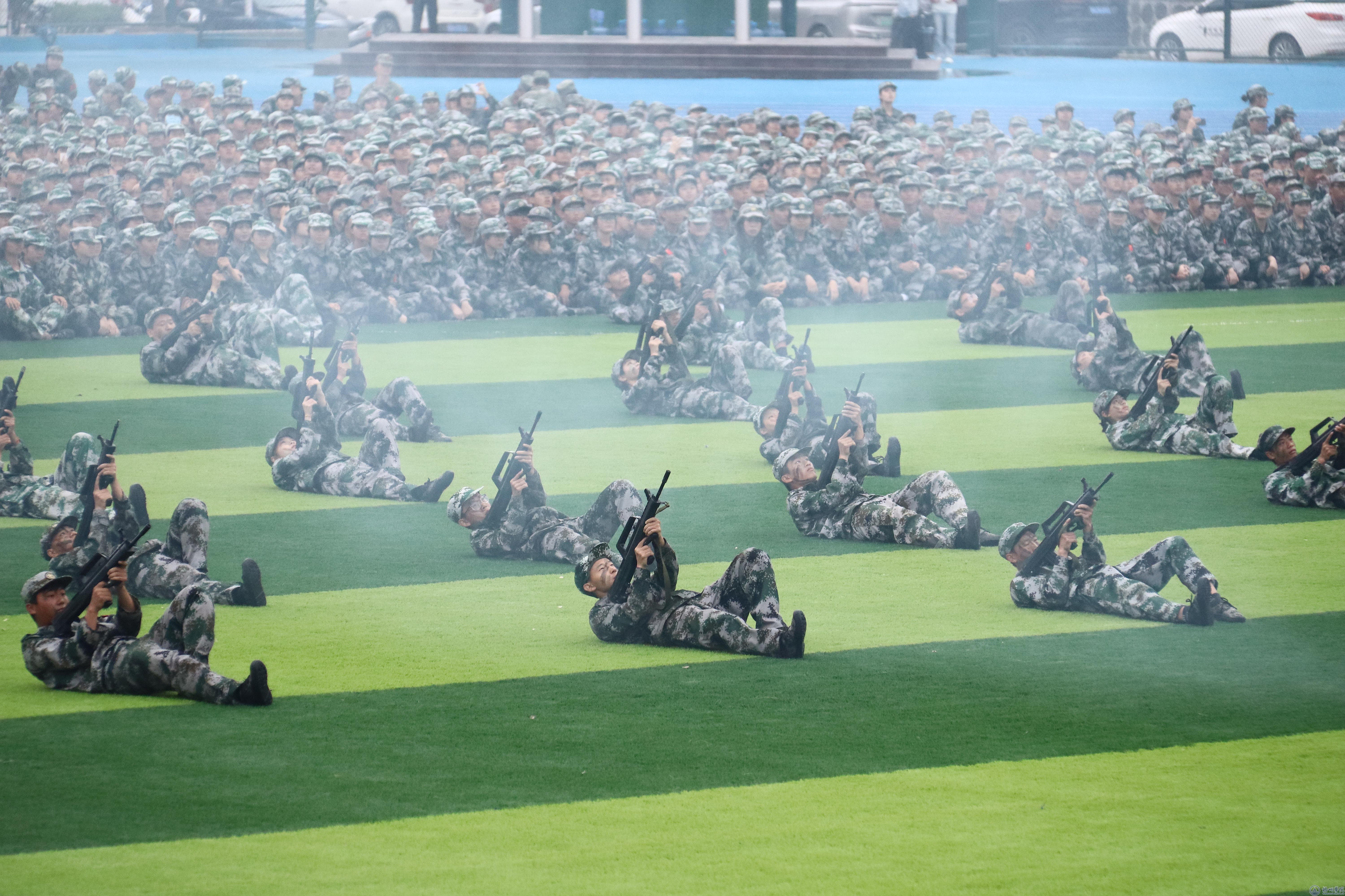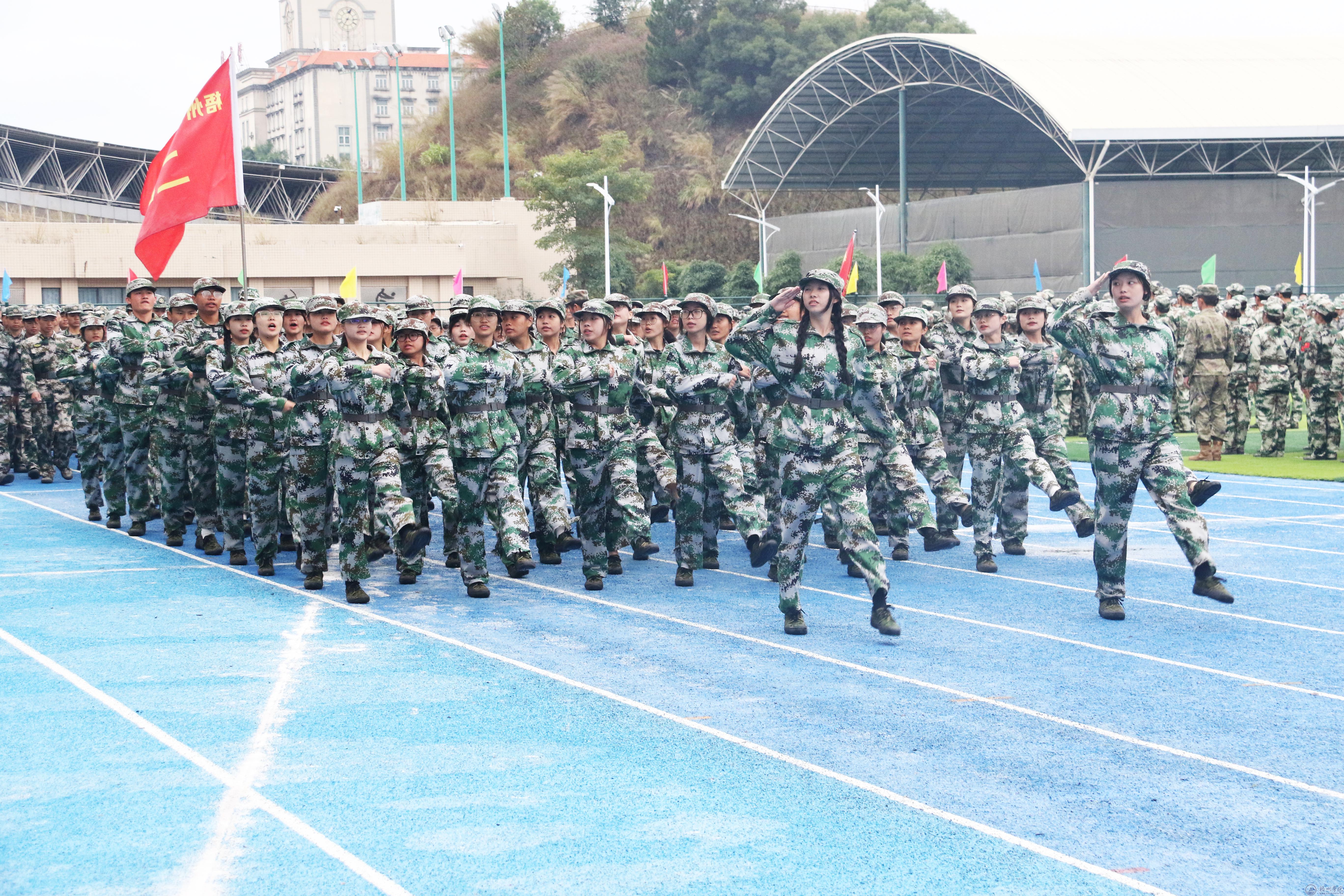 在新生军训会操中,梧州军分区领导和学校领导检阅新生军训团。4408名参训学生以4个营62个连为单位,统一身着军绿色迷彩服,昂首挺胸、气势豪迈、步伐整齐依次通过主席台接受检阅。战术表演方队展示了战术持枪、跪姿、坐姿、仰姿、卧姿射击,持枪搜索前进、复杂情况下持枪射击姿势转换与射击,持枪搜索等战术动作。他们穿着迷彩服,手持仿真枪械,迅速集结、分组行动,模拟应对各种突发情况。对抗方队展示了各式拳法和格斗技巧,拳拳到肉的招数和精准的腿法让在场观众发出阵阵欢呼声。匕首操方队队员手持匕首,动作矫健,如同猎豹出击。他们的动作快速而准确,每一次挥舞都充满了力量和速度。刺杀方队队员杀声整天,豪情满怀,在一突一刺,一防一击中尽显青年学子保家卫国的决心。