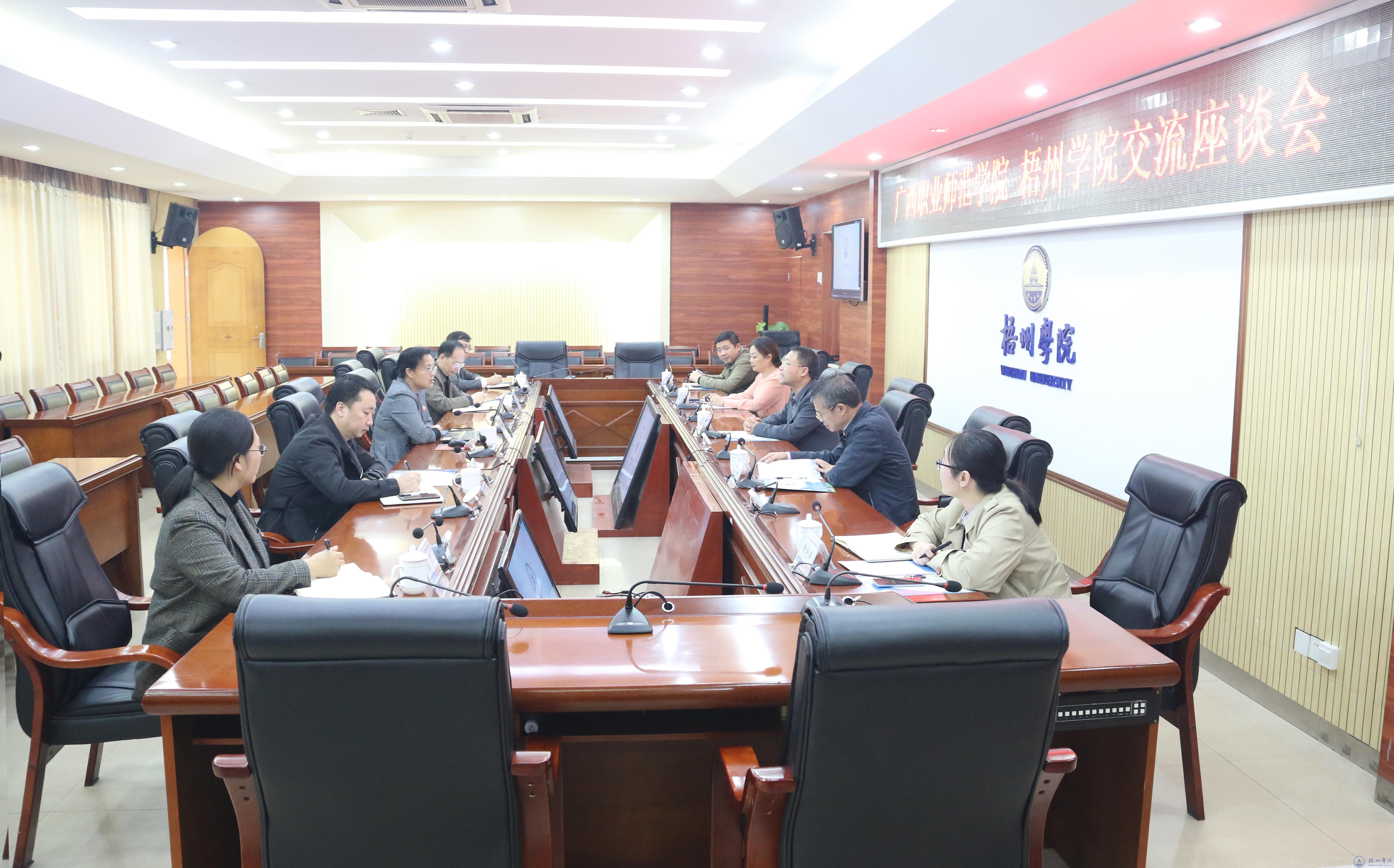 在明理楼八楼第一会议室召开的座谈会上,韦仕珍介绍了我校办学主要情况以及学校未来发展主要目标任务等情况。她表示近年来学校发展势头向好,在课程建设、学科专业发展等方面取得不错的成绩,希望双方加强沟通与交流,合作共赢,共谋发展。周鸿认为我校在建设管理方面的经验值得借鉴,希望两校能在管理体系和治理能力等方面互学互鉴,共同推进两校发展建设步伐。双方围绕学校管理体系、教育教学管理、职称评审、人才培养等工作展开进一步交流和探讨。