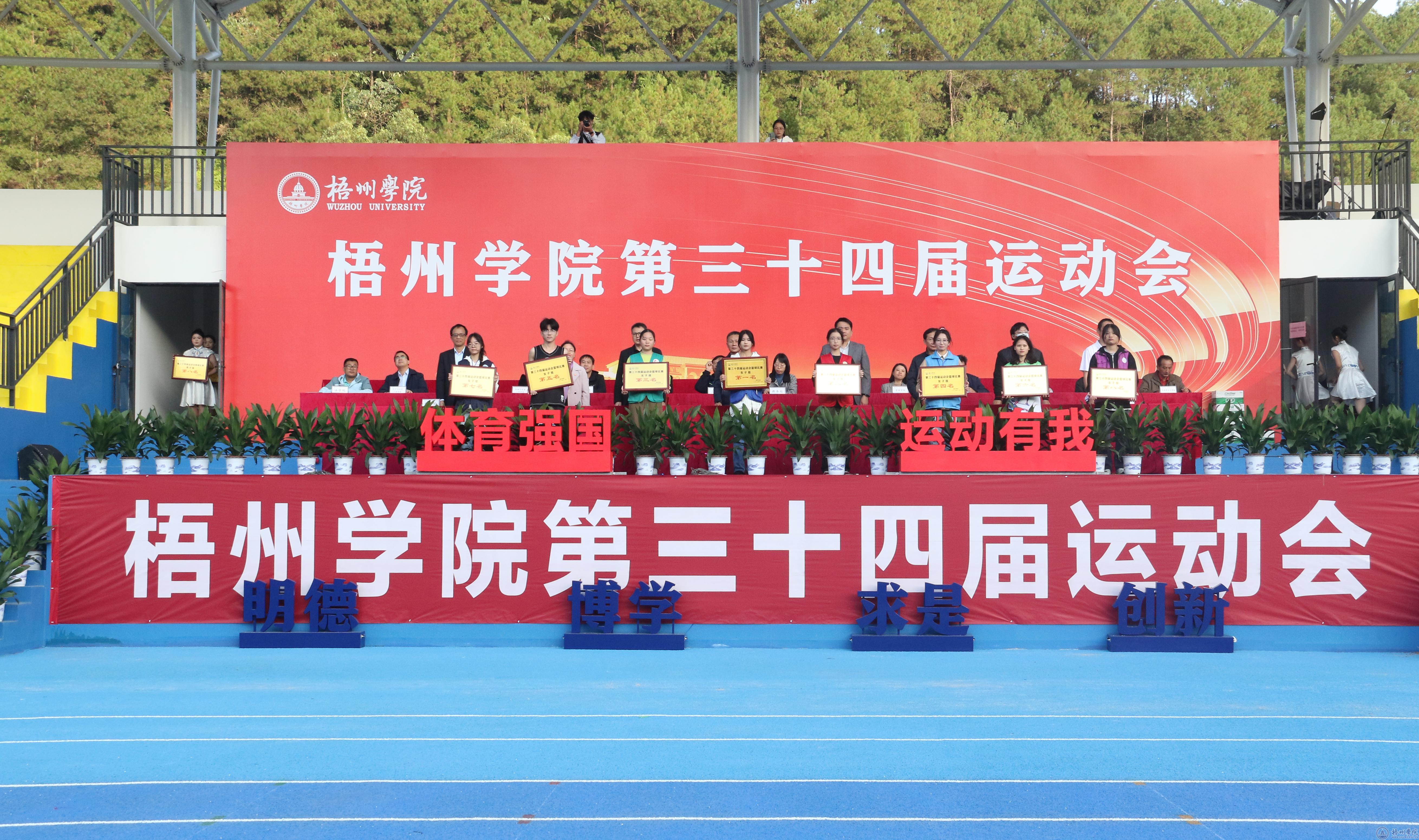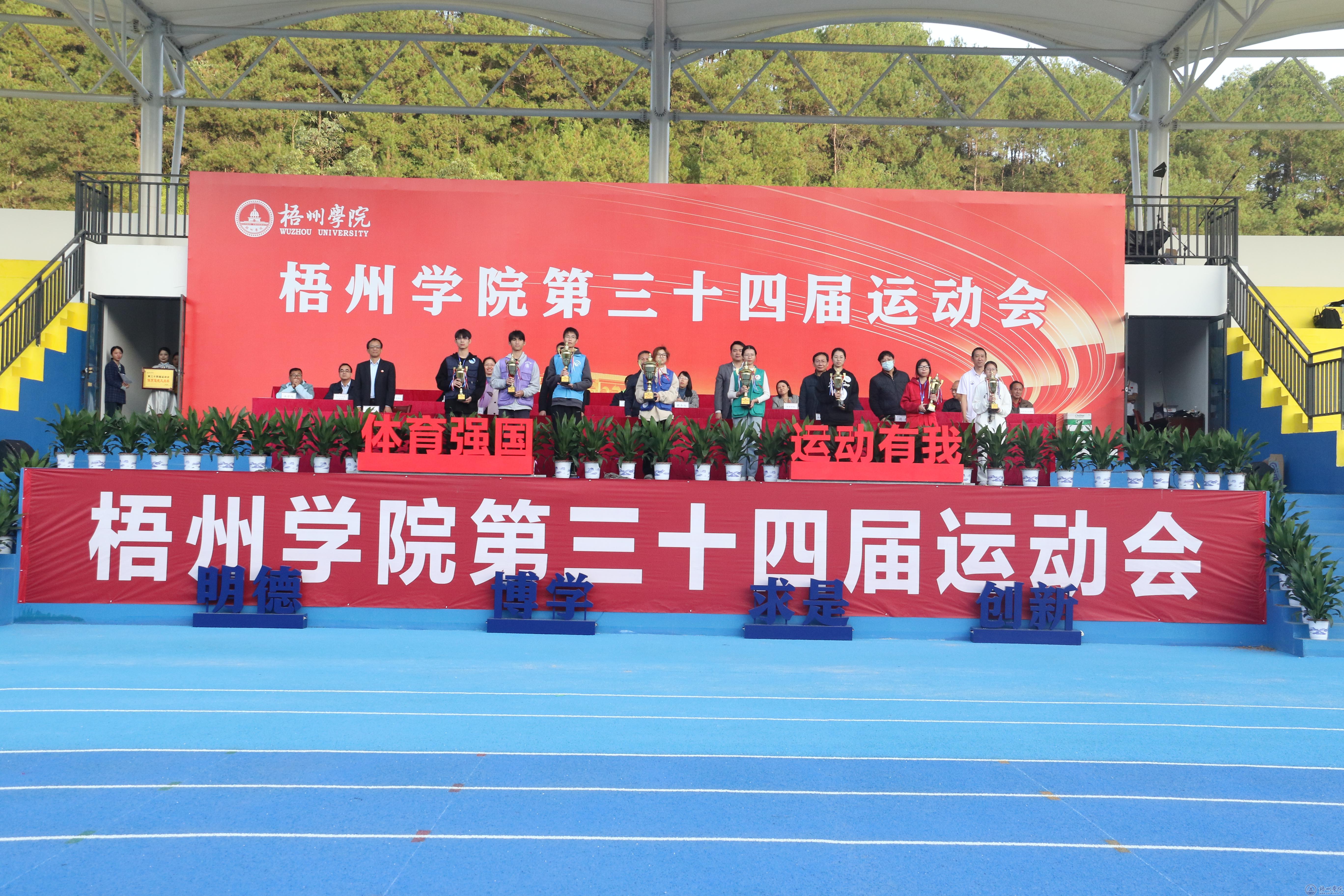 在主席台第一排就座的领导为获奖的集体和个人颁发获奖牌匾和证书。学校副校长覃雄彪致闭幕式辞。他认为本届运动会是我校又一次成功的体育盛会,也是我校全面贯彻党的教育方针、加强青年体育工作及德智体美劳多元育人的重要体现。来自全校各二级学院学生运动员2718人次,参加了田径、篮球等13个比赛项目,他们在比赛中展现了自己的才华与实力,用汗水和努力诠释了体育竞技精神。希望大家在运动会中所展现的优良品质和团结精神,能够渗透到学习和生活中的每个环节,让青春更有质感;将运动会中品悟到的担当与坚持、拼搏与奋进汇聚成实现强国梦的磅礴伟力,让青春更有意义。