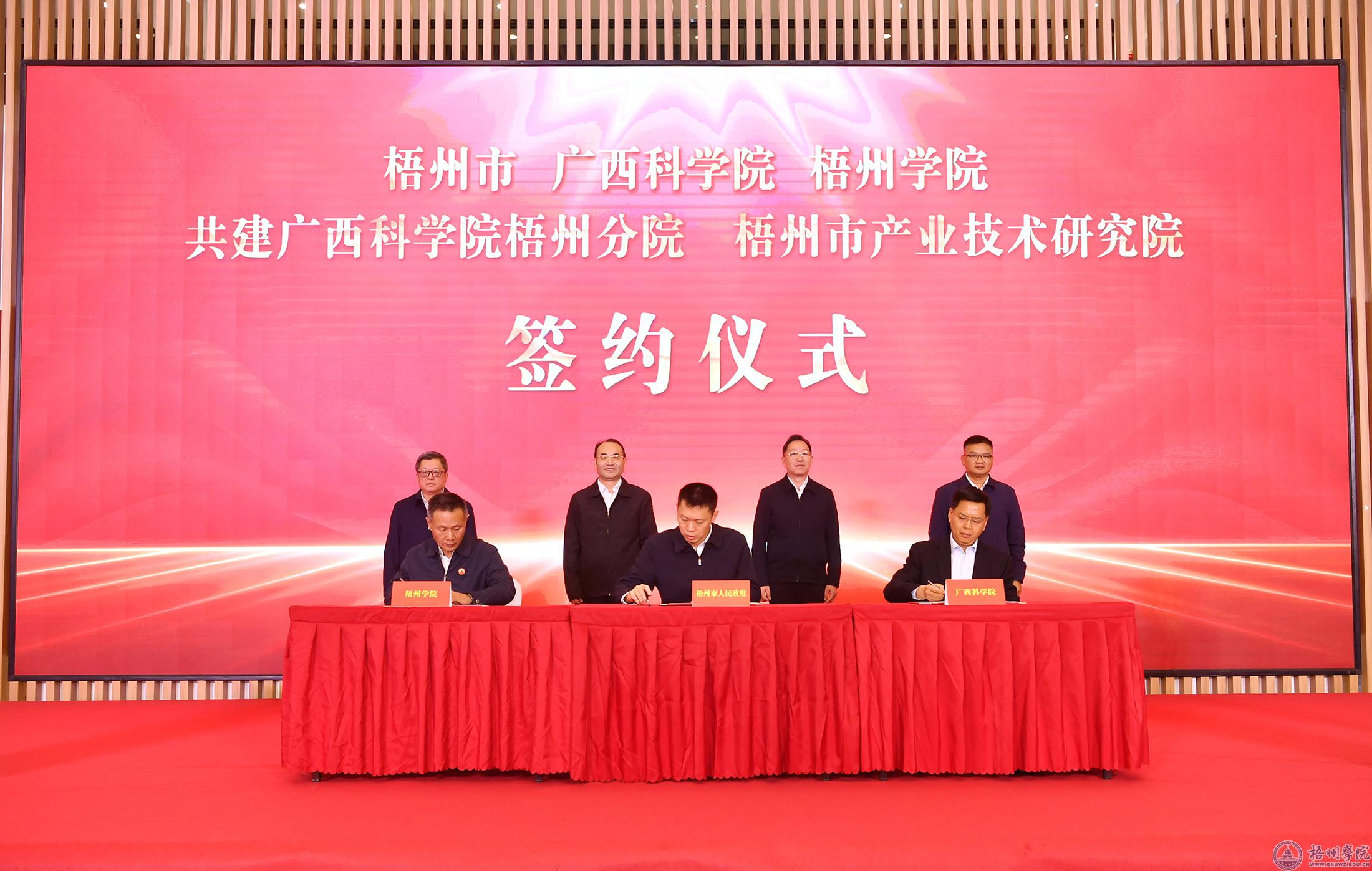 在李振品、元昌安、杨奔等领导的见证下,梧州市委常委、常务副市长汪东明,广西科学院副院长黄志民,我校副校长覃雄彪共同签订了共建广西科学院梧州分院、梧州市产业技术研究院协议。李振品、元昌安、杨奔等共同为广西科学院梧州分院揭牌,汪东明、黄志民、覃雄彪等为梧州市产业技术研究院揭牌。仪式上,广西科学院还分别与梧州市不锈钢、六堡茶、中医药、新材料、新装备、新能源等产业领域的多家企业签订项目战略合作协议。