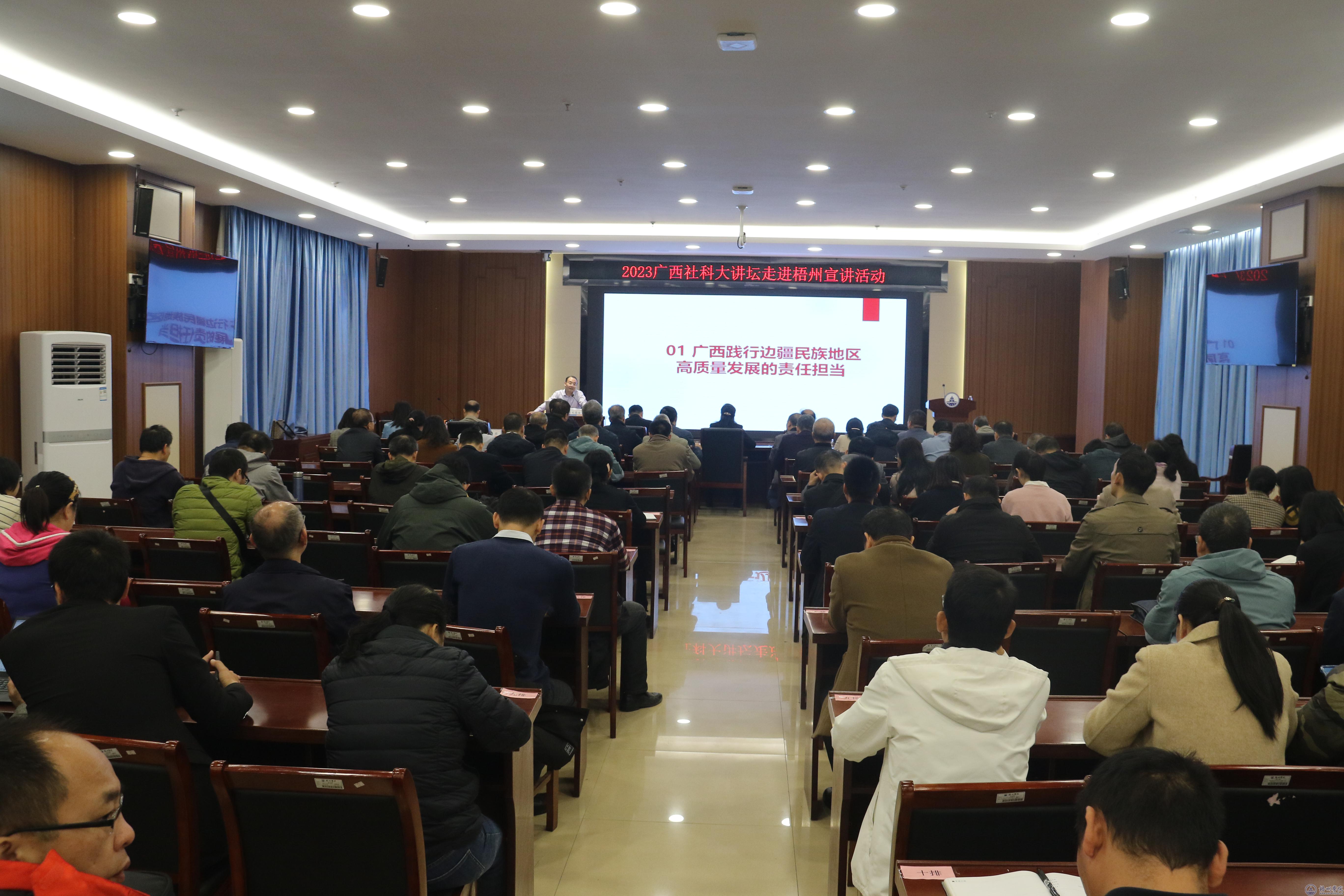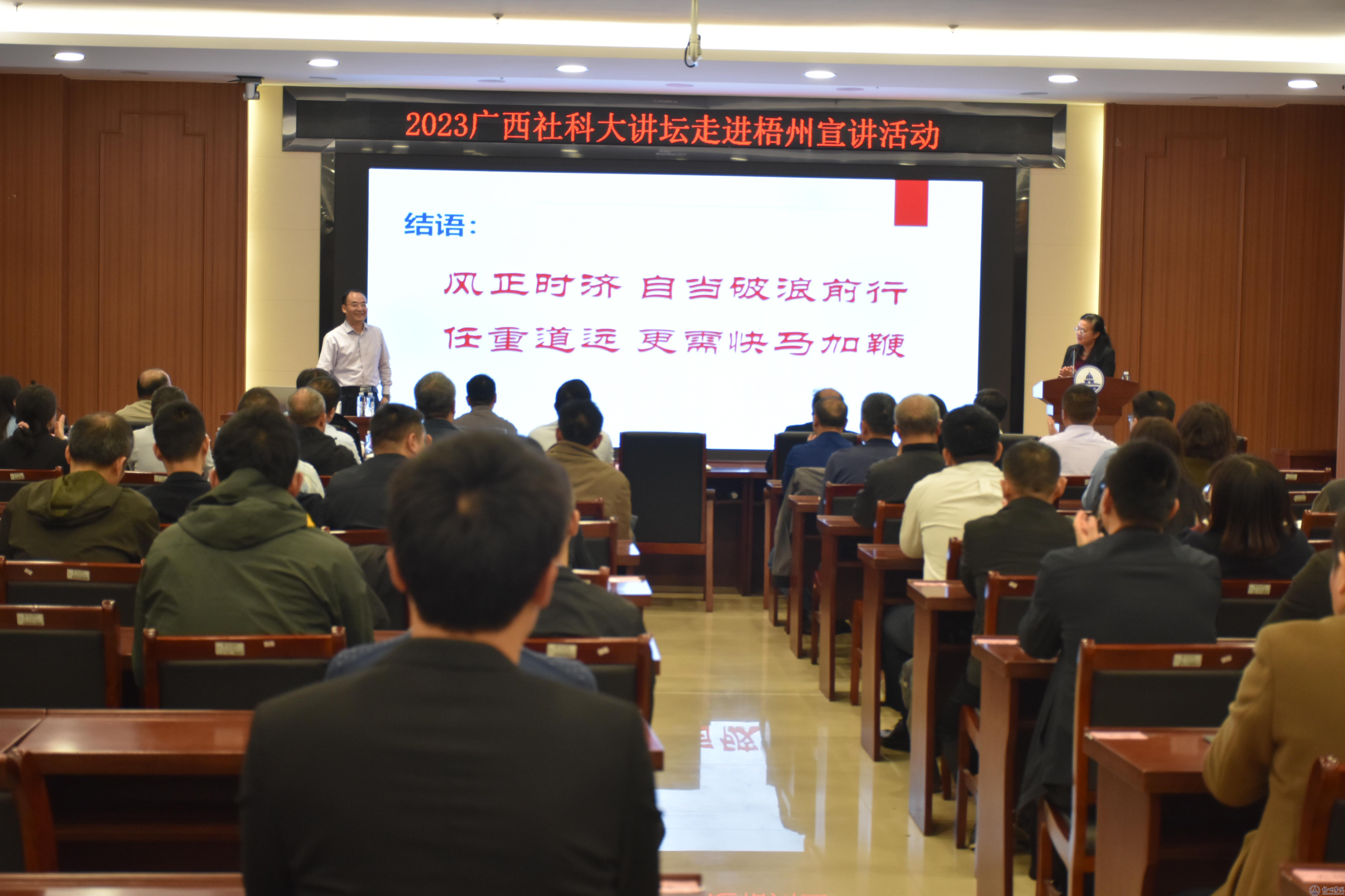11月16日,由广西壮族自治区社会科学界联合会主办,广西非公有制经济发展研究会联合梧州学院承办的2023年广西社科大讲坛走进梧州宣讲报告会在梧州学院举行,特邀广西科学院党组书记、院长、二级教授元昌安作专题宣讲,梧州学院党委书记韦仕珍主持宣讲。