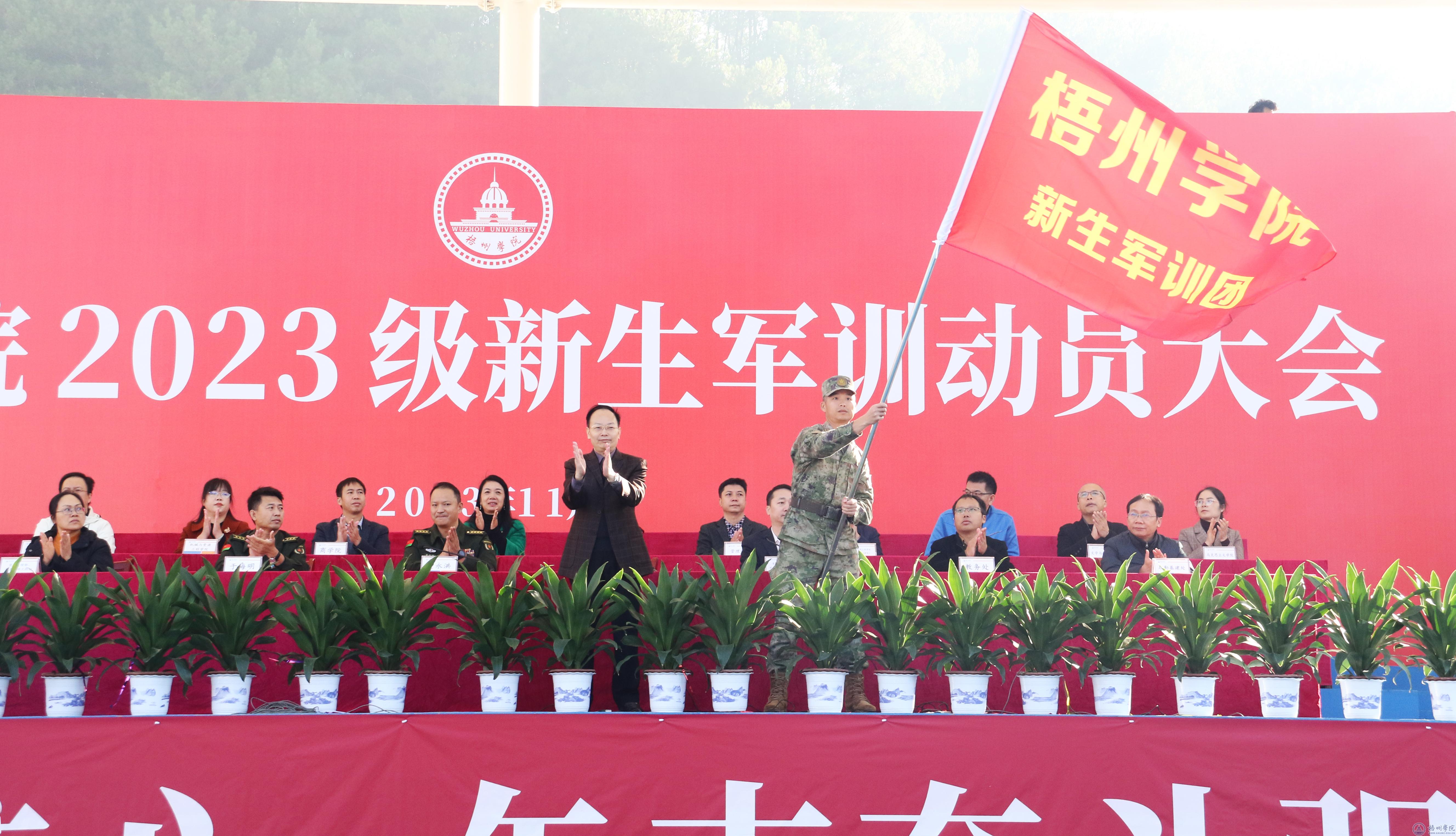 学校党委副书记梁业华为新生军训团授“梧州学院新生军训团团旗”。