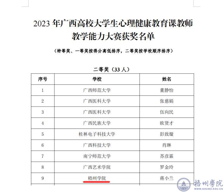 近日,自治区教育厅公布了2023年广西高校大学生心理健康教育课教师教学能力大赛获奖名单,我校参赛教师蒋小兰获得2023年广西高校大学生心理健康教育课教师教学能力大赛二等奖。