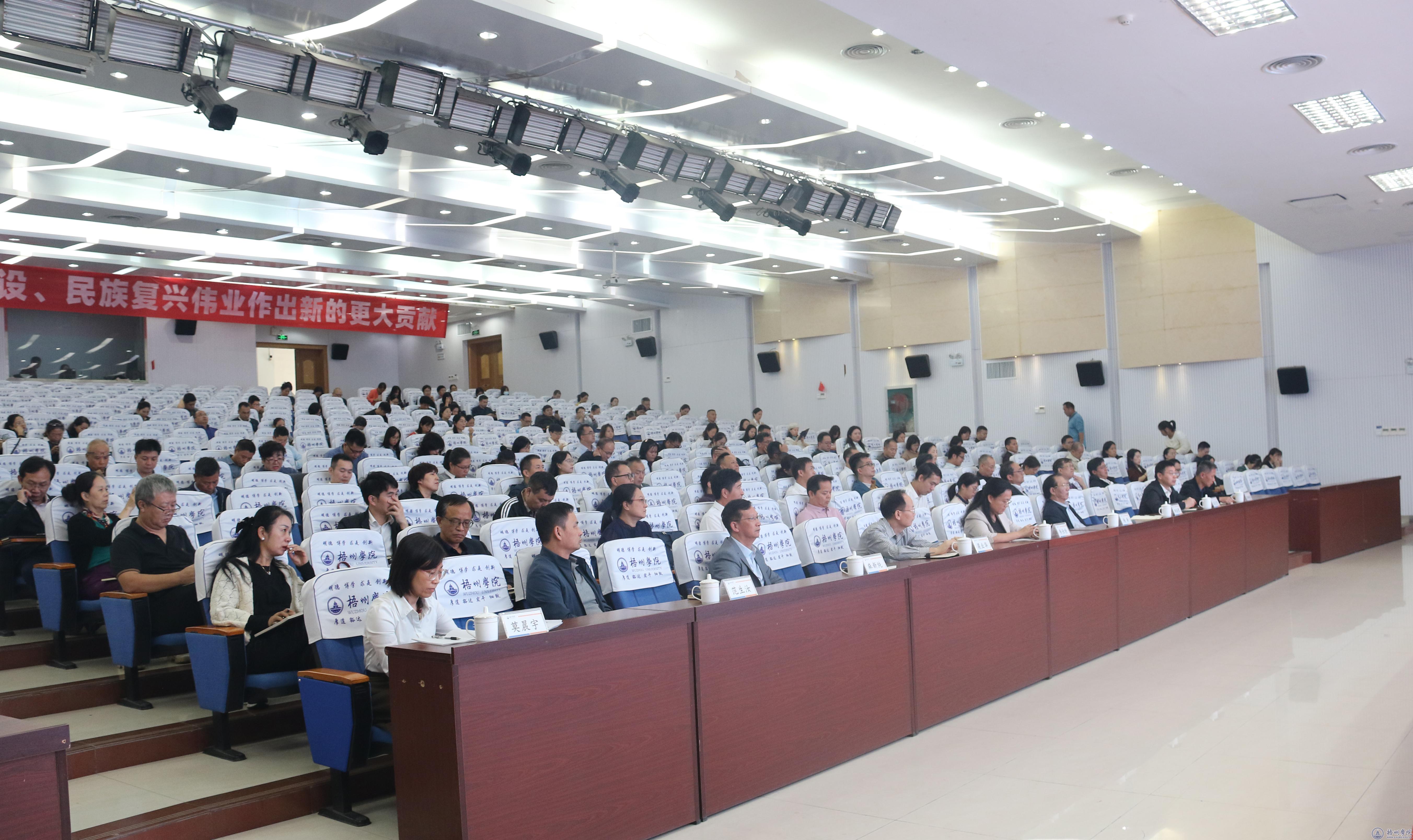韦仕珍书记在主持讲话中对钱国英教授的指导表示感谢。她认为钱国英教授的讲座从国家发展战略层面,结合地方经济社会发展需求和梧州学院的发展实际进行了深入的分析,政策性、指导性很强,针对性很高,对梧州学院未来的建设和发展很有帮助。