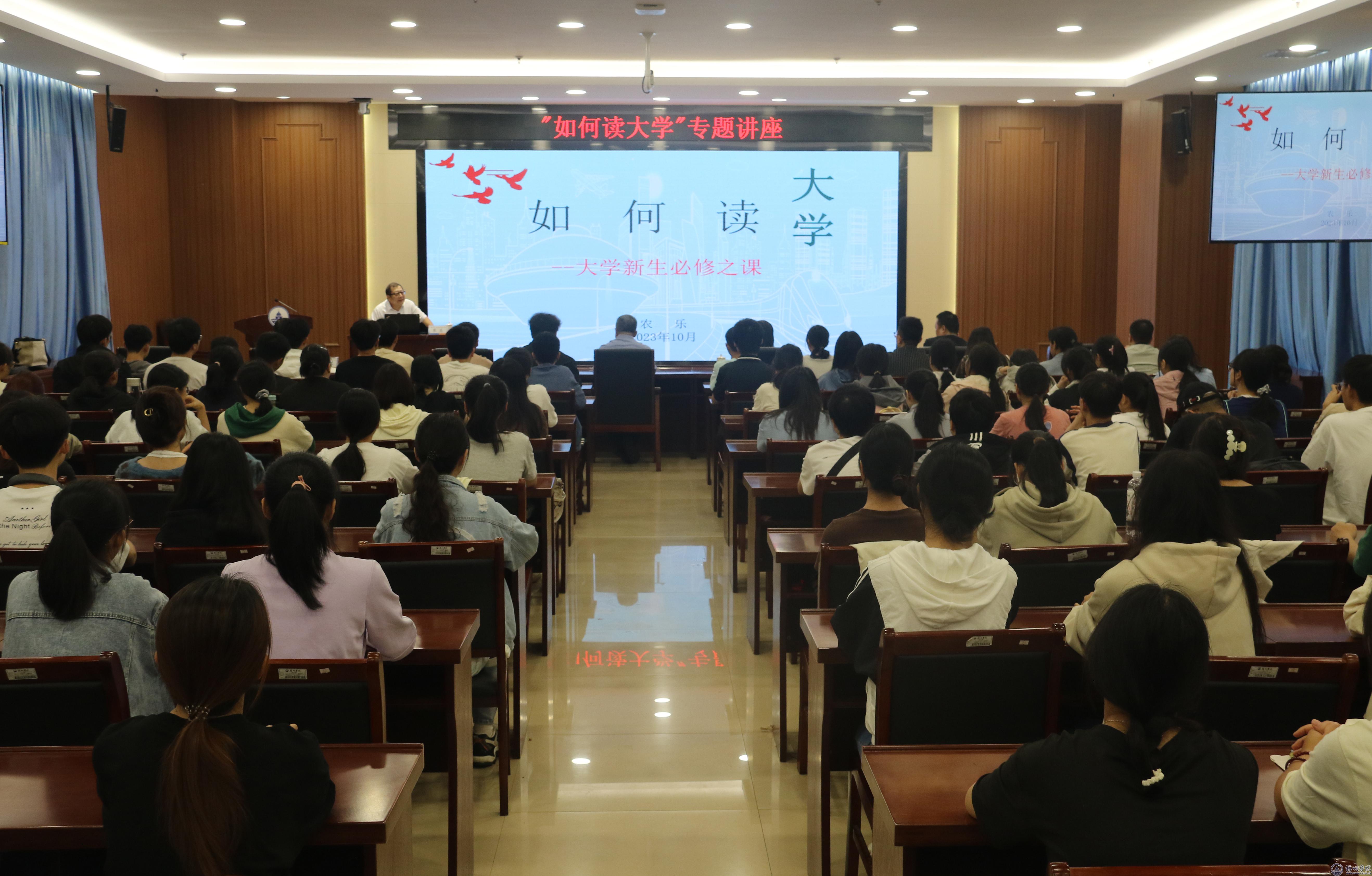 讲座现场,农乐从“为什么要上大学”“大学是干什么的”“如何度过大学生活”三个方面进行讲述。他指出,大学生首先要明白自己上大学的目的,只有清楚自己的目标,才能找到正确的方向,不虚度大学四年时光;大学是党和国家培养人才的摇篮,肩负着为党育人、为国育才的光荣使命。关于如何读好大学,农乐结合相关视频,给出了学好专业技能、明确目标规划、多读书读好书、培养坚韧不拔的毅力、建立良好人际关系等多方面建议。