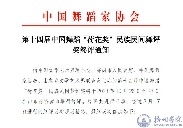 近日,从有关通知获悉,由中国文学艺术界联合会、济南市人民政府、中国舞蹈家协会、山东省文学艺术界联合会主办的第十四届中国舞蹈“荷花奖”民族民间舞评奖将于2023年10月26日至28日在山东省济南市举行终评。我校原创舞蹈《长鼓悠悠》将到现场参加评奖。