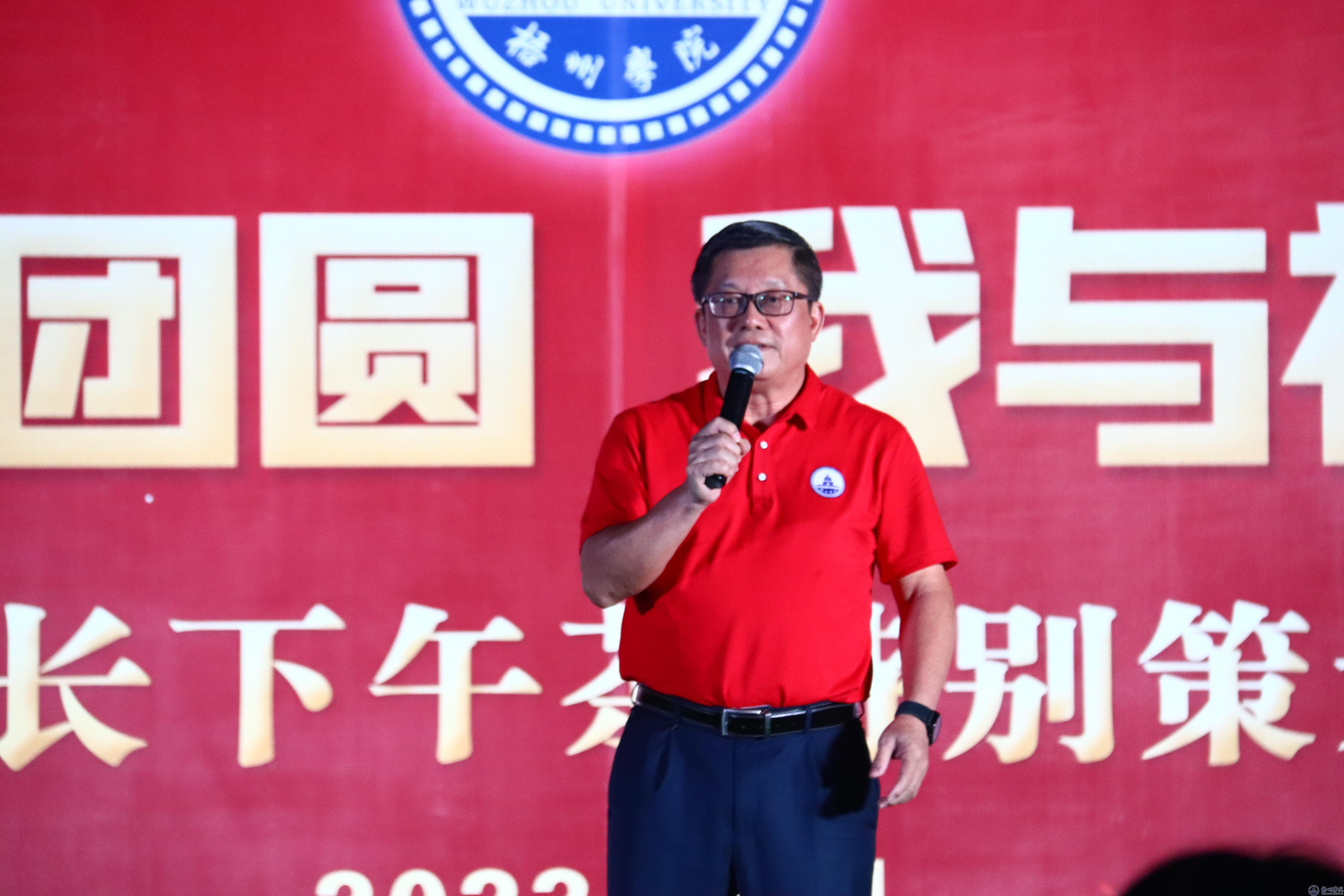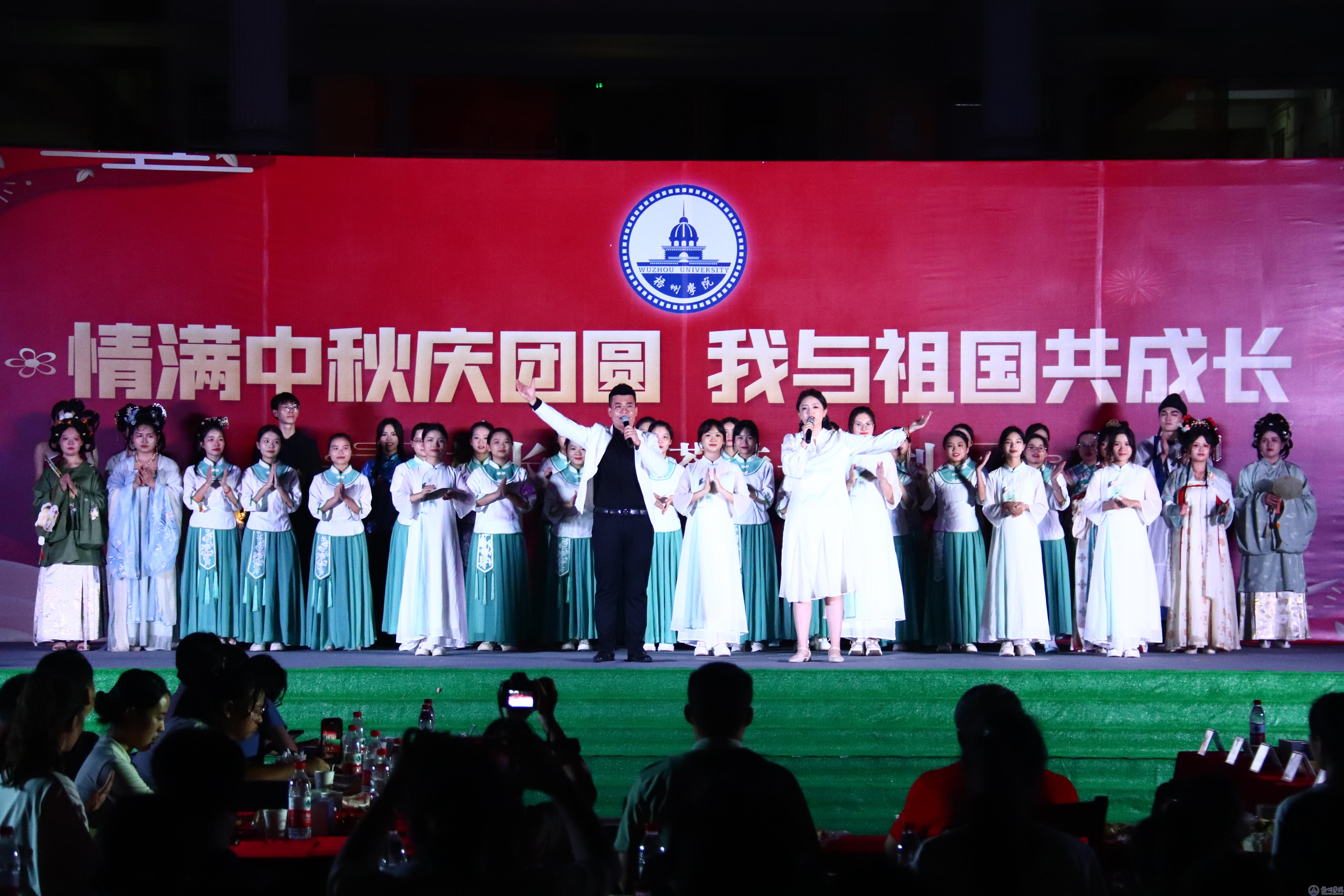 中秋月正圆,家国情愈浓。中秋国庆双节前夕,为了加强青年学子爱国主义教育,大力弘扬中华民族传统文化,营造爱国爱家、幸福团圆的和谐氛围。9月28日晚,学校在明理楼前举办了“情满中秋庆团圆,我与祖国共成长”校长下午茶活动。学校校长杨奔、副校长覃雄彪,梧州市文联党组书记、主席林敏华,梧州市书法家协会主席梁雄杰,梧州市戏剧曲艺家协会副主席苏凤冰,广西戏剧家协会会员梁家军,学生工作部(处)、校团委、各二级学院的负责人以及师生代表欢聚一堂,共赏月满团圆夜,庆祝中华人民共和国成立74周年。
