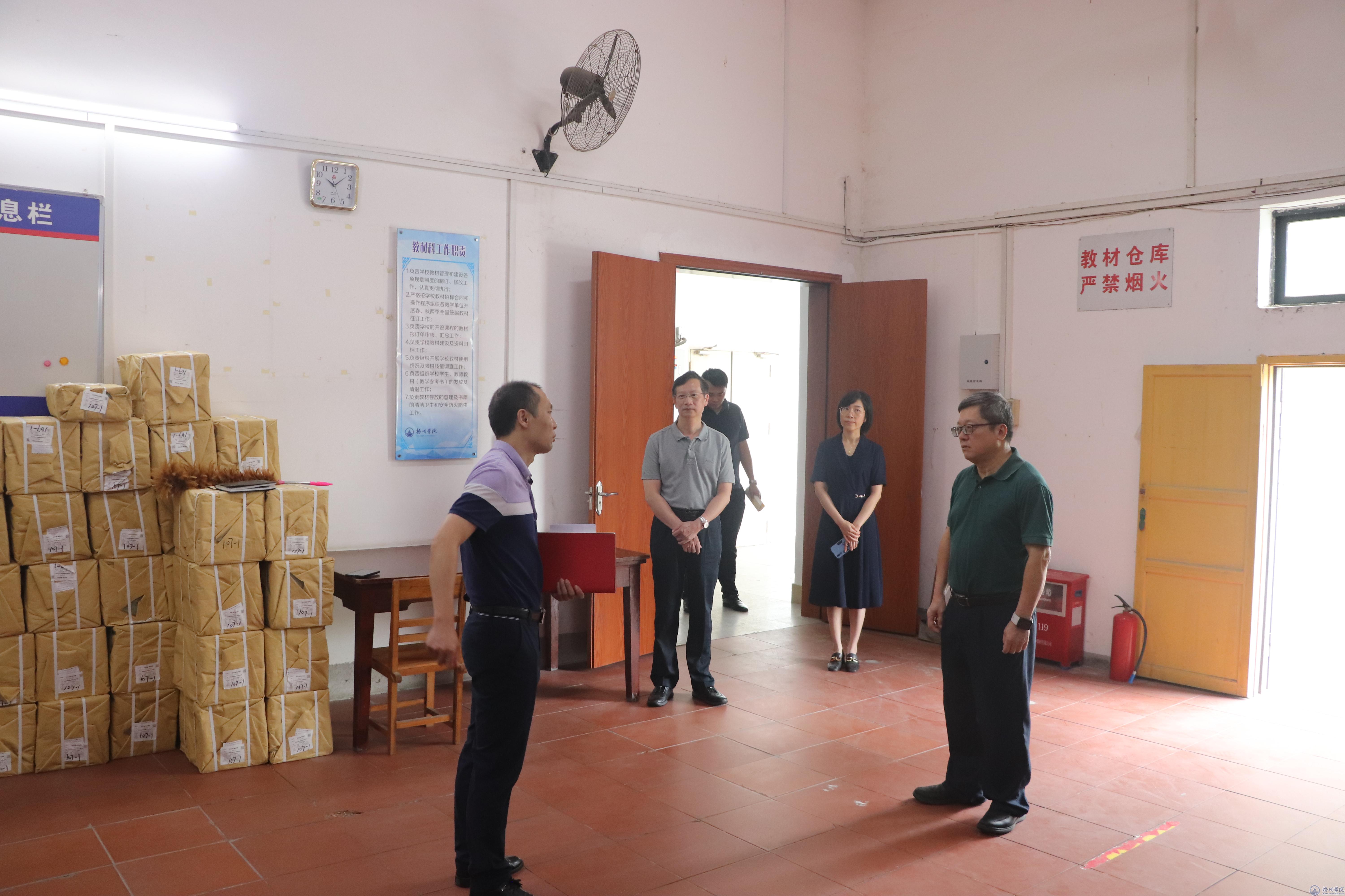 杨奔一行先后走访检查教材科、第六食堂、综合楼宿舍、明科楼。杨奔在教材科听取了新学期教材征订工作汇报,他指出,要做好教材征订工作的准确细致,要加强与教室管理部门的沟通,确保开学第一天顺利开展教学;在第六食堂,杨奔详细了解了目前食堂的使用情况后,他强调,要把食品安全放在首位,做好后厨的卫生管理,要督促各食堂要做好开学前的各项准备工作;在综合楼宿舍,杨奔仔细查看了宿舍生活设施配备的情况,他强调,要做好基建改造验收工作,检查安全质量,做好精细化管理与服务,确保新学期宿舍能投入使用;在明科楼一楼报告厅,杨奔查看了广西普通高校专业带头人赴粤高校交流学习工作会议的准备情况,要求相关部门做好会议召开的各项准备工作,确保会议顺利进行。