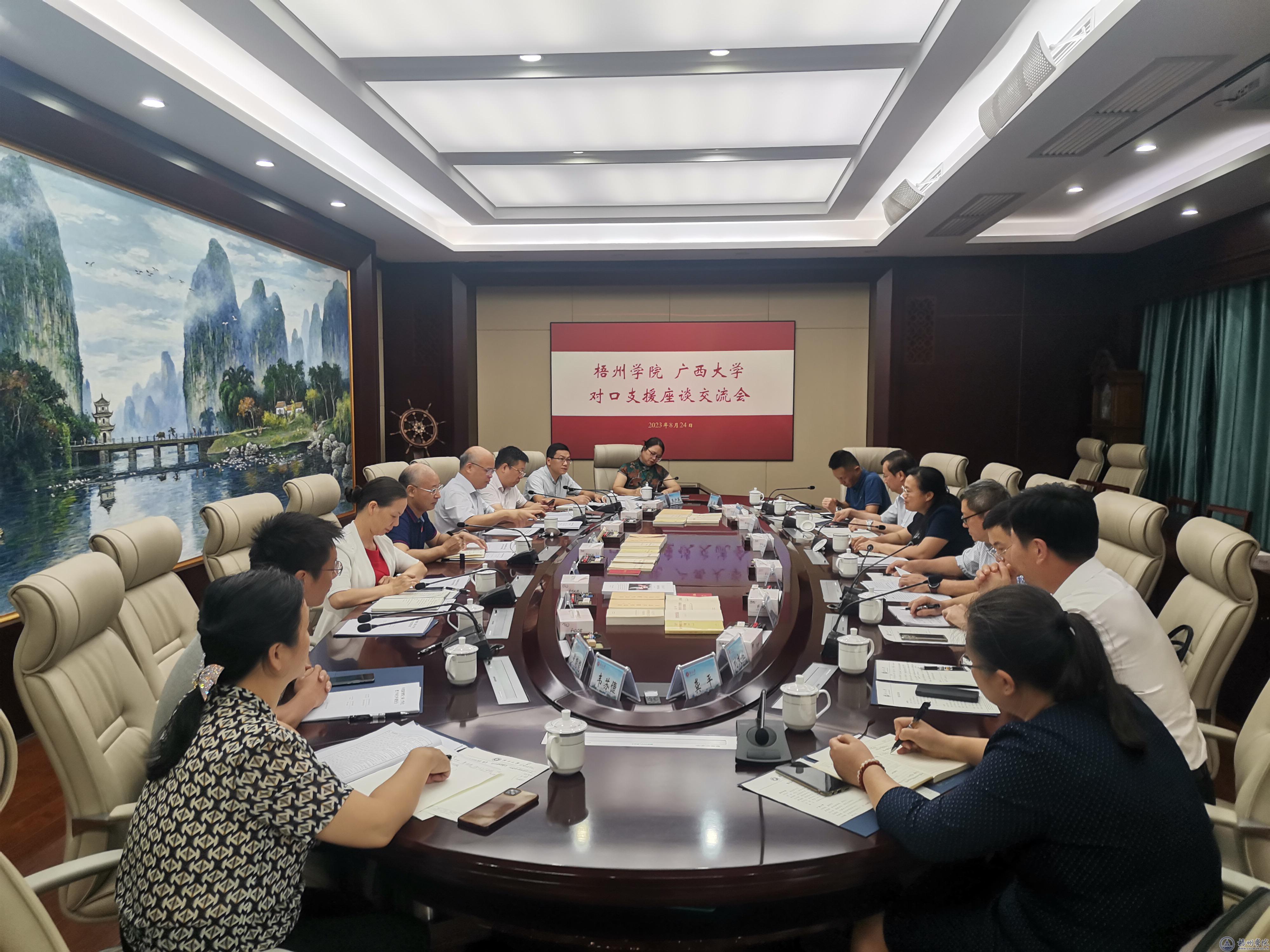 为贯彻落实学校第四次党代会精神,推动学校事业再上新台阶,近日,韦仕珍书记、杨奔校长带队到广西大学交流对口支援工作。自治区政协副主席、广西大学党委书记王乃学,党委副书记、校长韩林海会见了我校领导。广西大学副校长冯家勋,校党委常委、副校长梁恩维;我校副校长麻新纯、纪委书记宾月景、副校长覃雄彪参加对口支援座谈交流会。