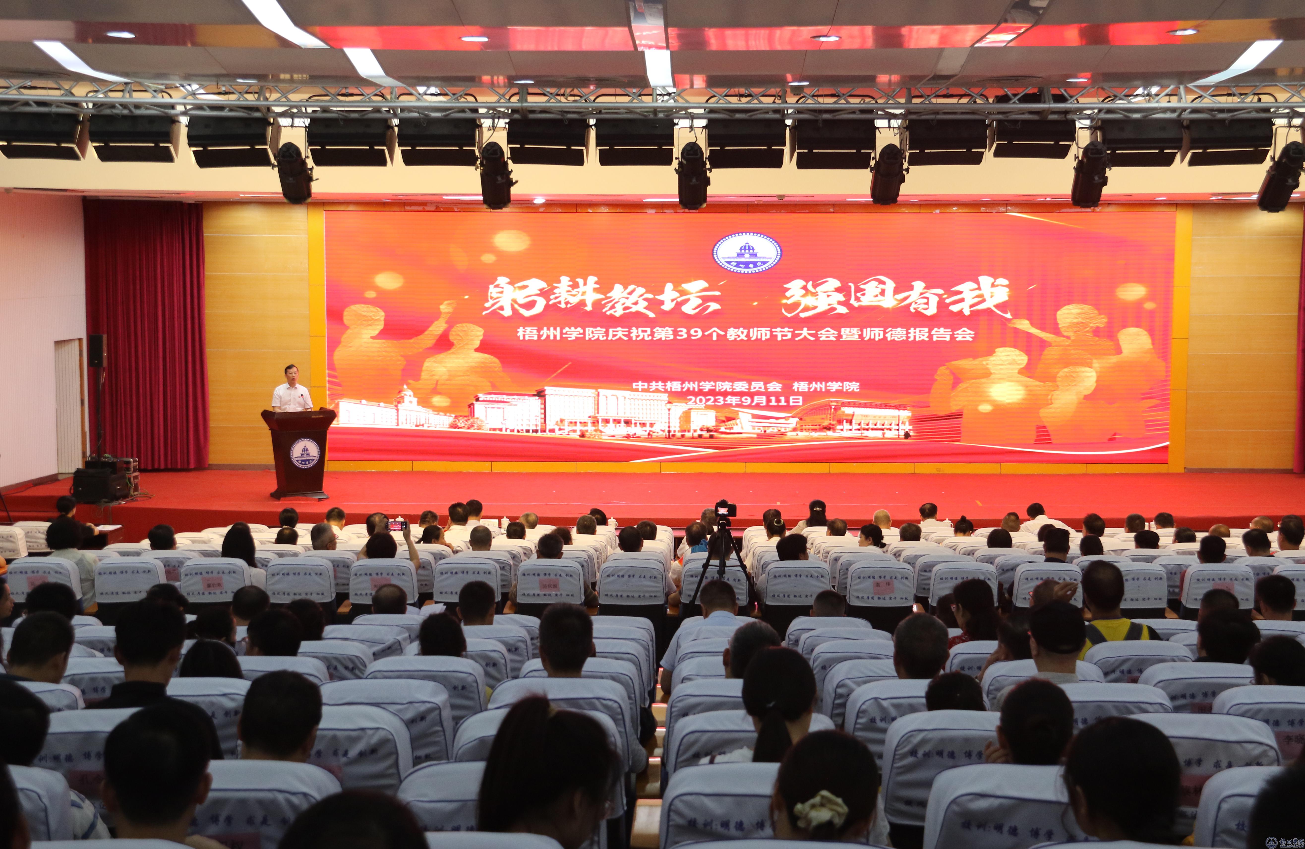 会上,与会人员共同观看了专题片《习近平的教师情》,重温习近平总书记和人民教师在一起的温情瞬间。举行了新入职教师入职宣誓仪式,在校长杨奔的带领下,新入职教师们紧握右拳,庄严宣誓,以铿锵的誓言承诺,表达了投身教育事业的决心。慰问了扎根在梧州学院(包括前身:广西大学梧州分校、梧州市教育学院、梧州师范学校)从事教育、教学、后勤服务工作30年及以上的在职在岗教职工,“扎根梧院30年”教职工分组上台接受表彰,学校党委书记韦仕珍、校长杨奔为他们逐一颁发荣誉纪念品并合影留念。全场响起热烈的掌声,对在梧院默默奉献30年的教职工们致以崇高敬意。