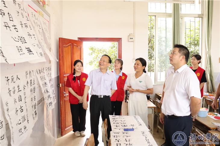 校党委副书记梁业华在苍梧县旺甫中心小学了解宝石与艺术设计学院实践团的“阳光书画屋”项目进展情况