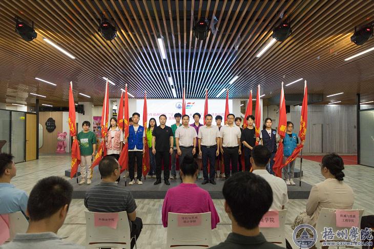 仪式上,校团委负责人介绍了今年暑期社会实践基本情况,出席活动的领导为各实践团队代表授旗,实践团指导老师代表曹旭、学生代表滕沛能分别进行了发言。