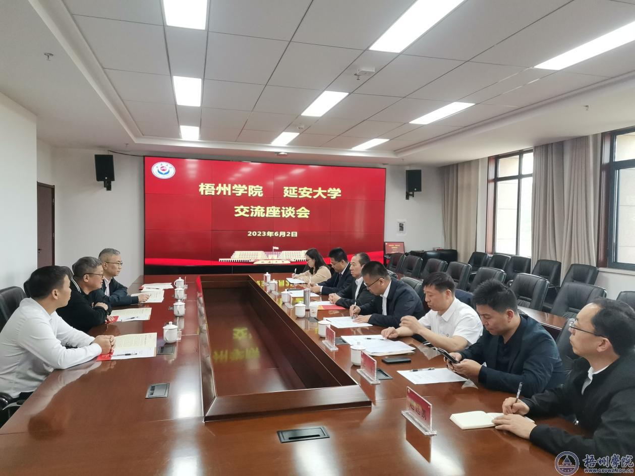6月2日下午,双方召开座谈交流会,延安大学校长高子伟热情接待了考察组一行,并详细介绍了延安大学历史沿革、发展及办学成就,重点介绍了学校贯彻落实习近平总书记对延安大学的重要指示批示精神、推进“一流学科”建设工作等方面的情况。杨奔校长对延安大学近年来取得的成绩表示赞赏,他介绍了梧州学院的发展历程和基本情况,希望通过深入交流,学习延安大学在一流学科建设、将红色文化融入教育教学过程等方面的好经验、好做法,促进两校共同发展。