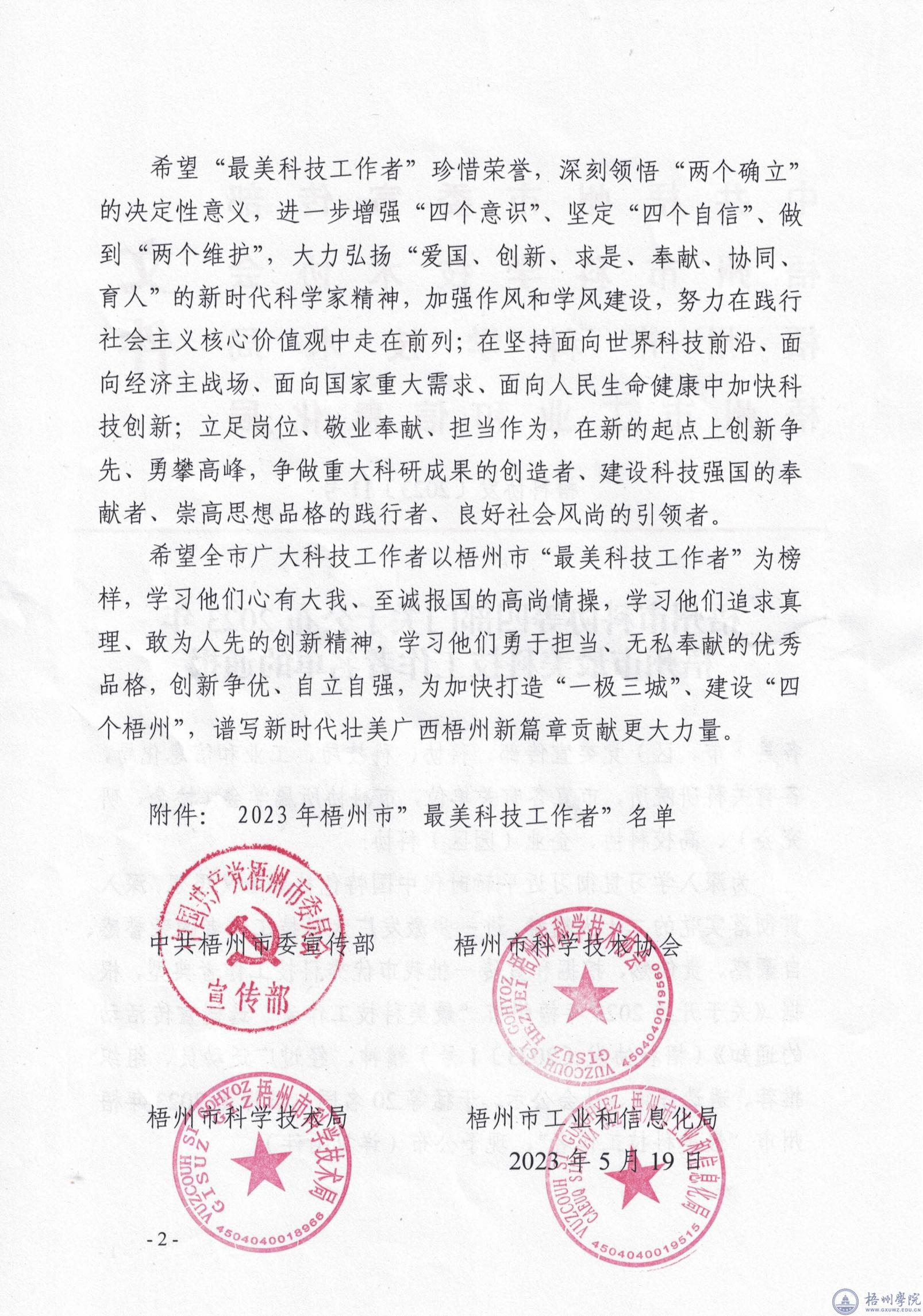 近日,梧州市科协等四部门公布2023年梧州市最美科技工作者名单,我校教师邓小林荣获“梧州市最美科技工作者”称号。