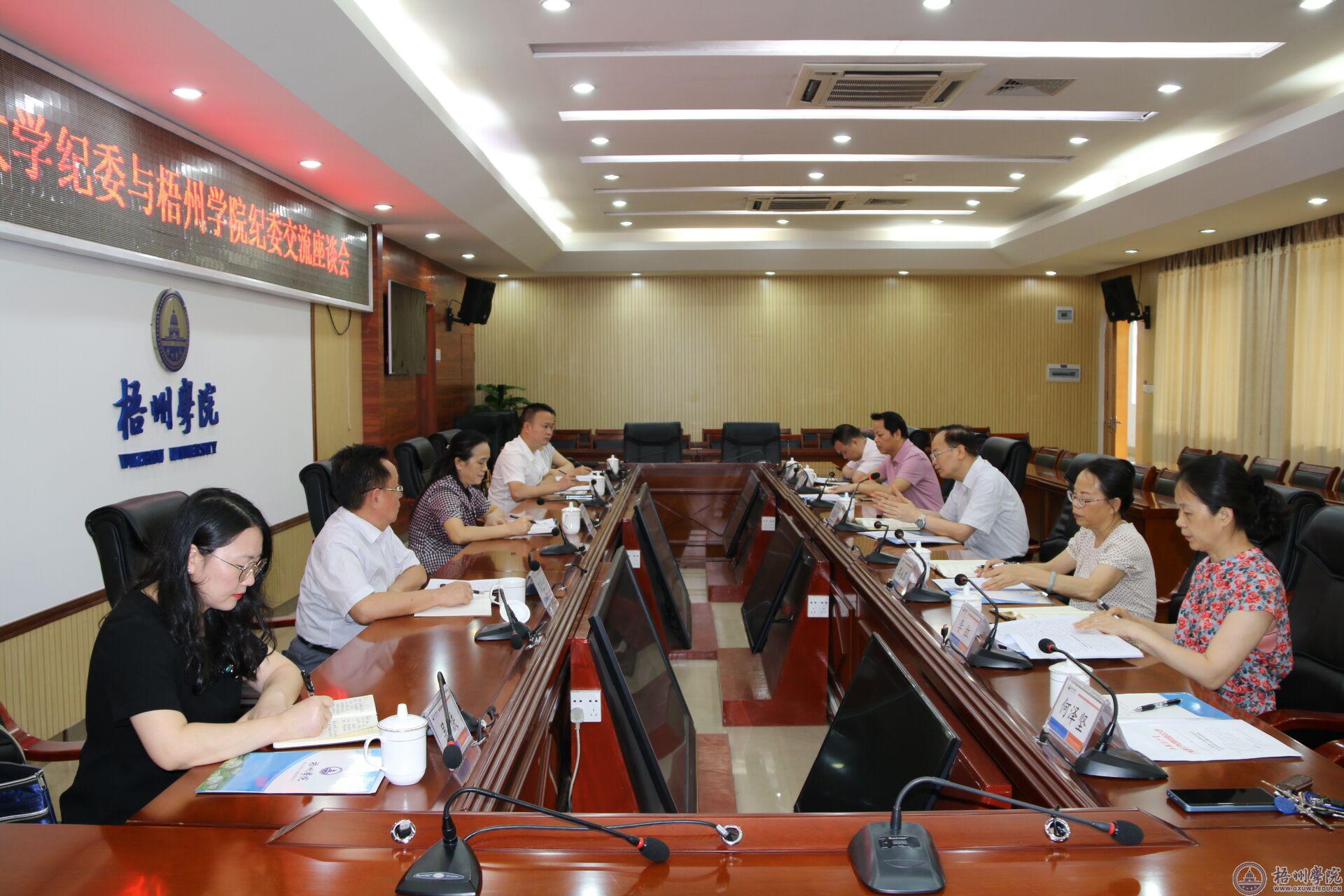 6月6日,广西民族大学党委常委、纪委书记韦雪芳一行5人到我校调研交流,座谈会在明理楼8楼第一会议室举行。学校党委书记韦仕珍会见了韦雪芳书记一行并表示热烈欢迎。学校党委常委、纪委书记梁业华主持调研座谈会。