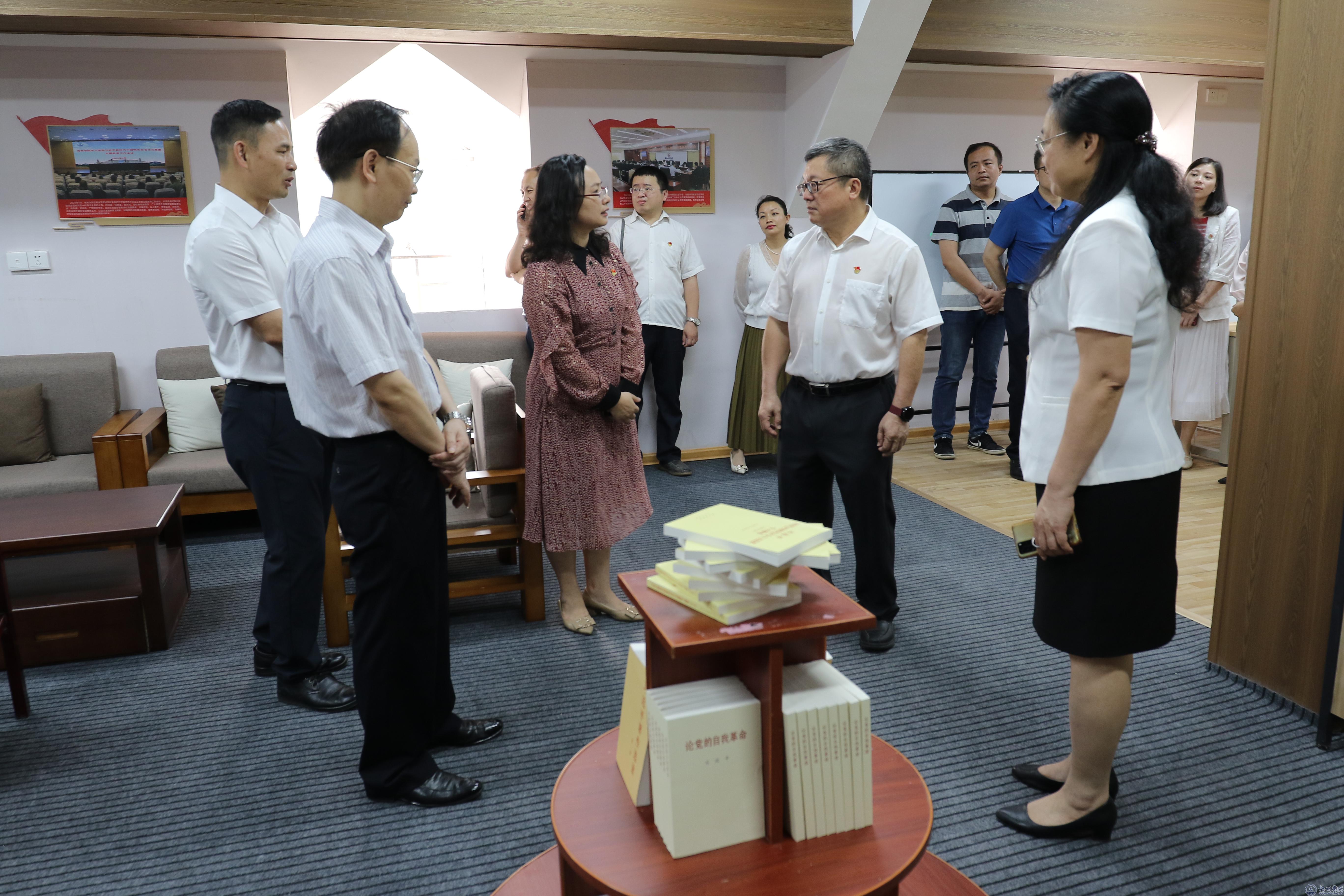 韦仕珍书记、杨奔校长一同为共读书屋揭牌。揭牌仪式结束后,校领导与大家一同参观了共读书屋,在党委宣传部负责人的介绍下,详细了解了共读书屋的建设初衷和历程、各个功能区的建设情况以及使用规划情况。