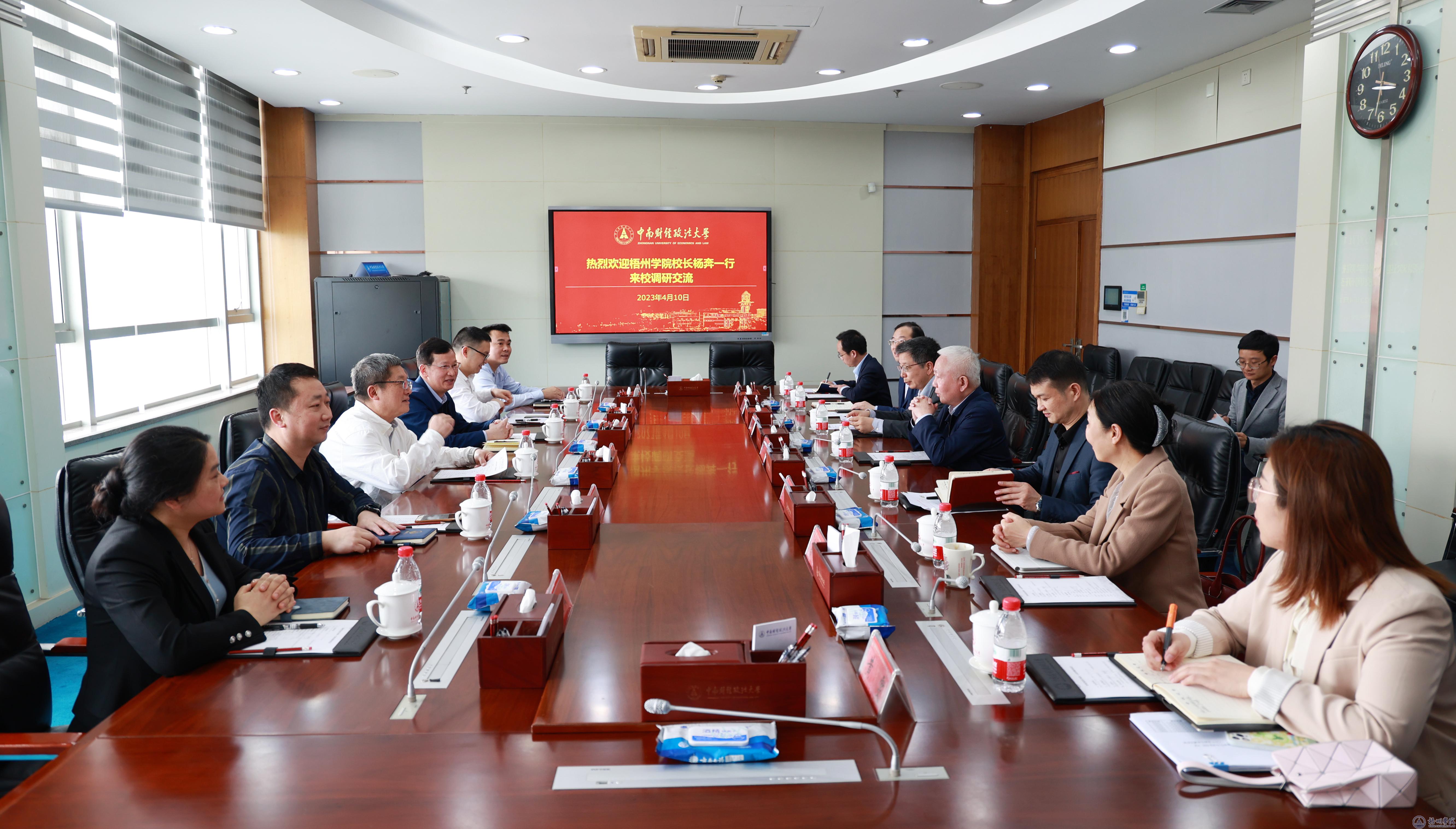 4月10日下午,中南财经政法大学校长杨灿明热情接待了考察组一行。座谈会上,杨灿明校长详细介绍了中南财经政法大学近十年改革发展所取得的成就,他表示中南财经政法大学与梧州学院友谊深厚,希望在新的发展阶段持续推动两校的战略合作走实走深。杨奔校长对中南财经政法大学领导老师长期关心支持梧州学院的发展表示感谢并邀请中南财经政法大学领导老师到梧州学院讲学,他表示希望通过加强两校的交流,共同推动校际深度帮扶工作。麻新纯对中南财经政法大学积极主动推动双方务实合作表示衷心感谢,对中南大学科建设成就给予充分肯定,表示此次调研收获满满,希望中南大向梧州学院输送更多优秀毕业生。