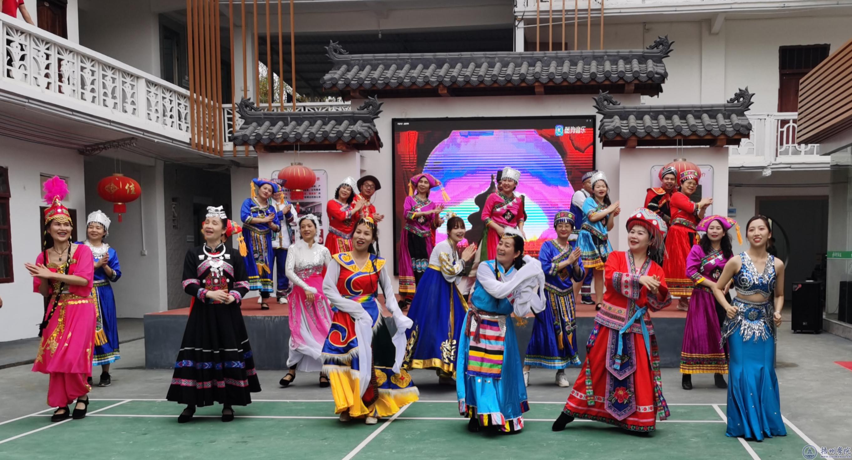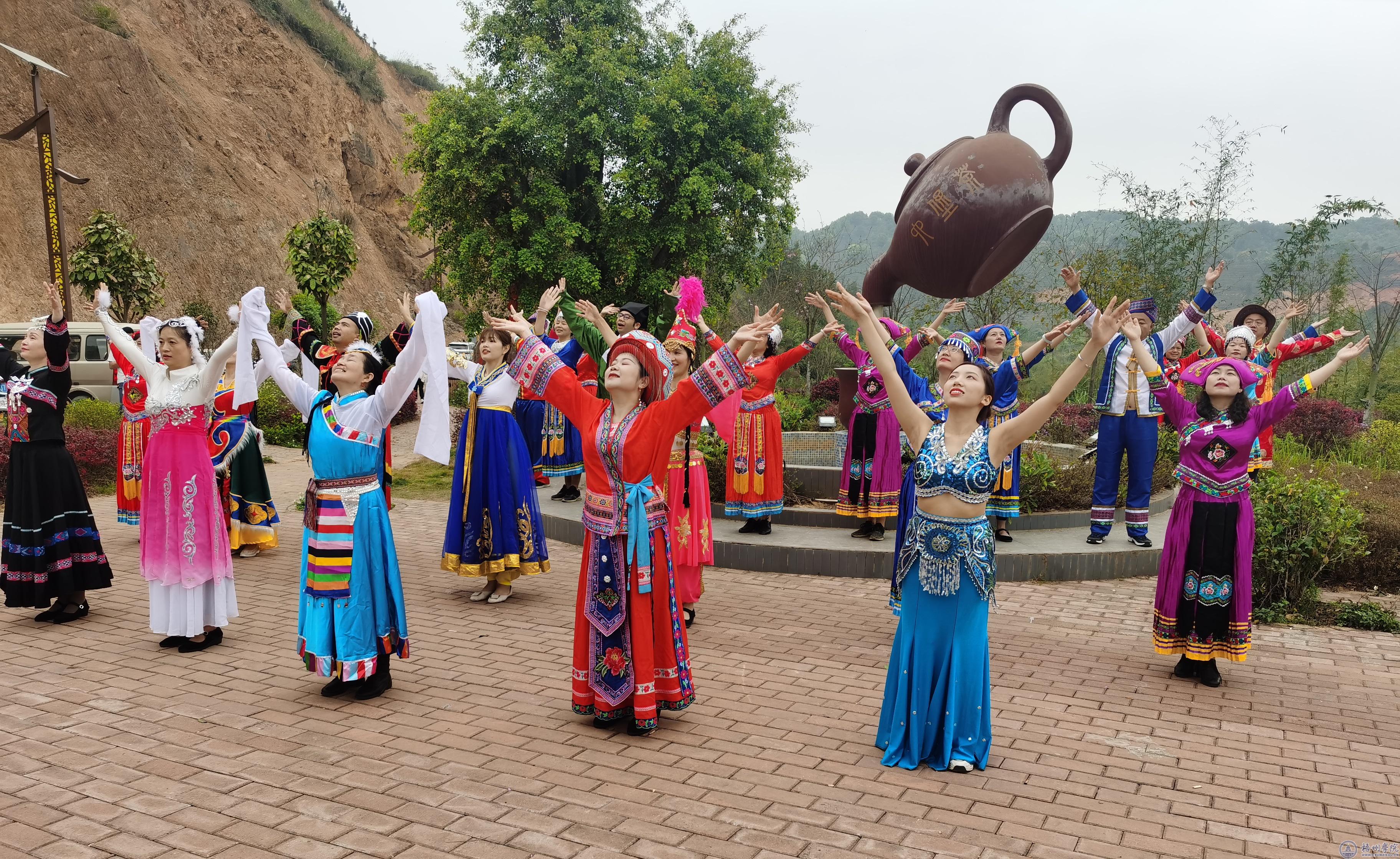 在梧州市六堡茶开茶节之际,学校组织各民族教职工代表及教职工合唱团在校园、六堡镇开展民族团结进步宣传活动。在鱼鳞坝、芊河茶厂、茶船古道起点合口码头、茶园,在东门广场、图书馆铸共广场、校友广场、北区宿舍广场,教工代表们身着艳丽的壮族、瑶族、傣族、藏族等民族服饰,伴着动听的民族音乐翩翩起舞,引得师生群众纷纷驻足观看。