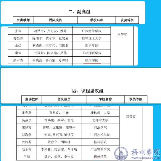 我校遴选的副高组梁尹杰老师、思政组伍靖老师及其团队,凭借网络评审成绩在参赛组别排名前50%的好成绩,均赢得了进入全区高校教师教学创新大赛决赛的门票。在决赛中,参赛教师(团队)通过比赛现场教学设计创新汇报和回答专家问题,充分展现了教学创新技能和风采。经过激烈角逐,梁尹杰、伍靖的2个团队获得第三届全国高校教师教学创新大赛(广西赛区)三等奖。