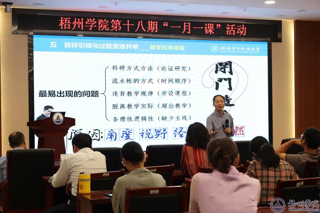 郭庆教授针对梧州学院历年来教师申报自治区教育教学改革工程项目立项情况,展开了目标明确,深入浅出的立项成败分析。讲座中,郭庆教授采用典型案例分析法、对比分析法现场展示了教改项目与科研项目的本质区别、教改项目申报策略、逻辑思维、创新点挖掘、攥写技巧等干货满满的内容,讲座全程贯穿了“授人以渔”的主题思想。郭庆教授最后鼓励青年教师,大学的灵魂是课堂,大学教师应以本科教育教学改革工程项目为抓手,在课堂教学中勇于开展教育教学实践创新,做到理念创新、教学创新、科研创新,努力成长为新时代优质教师队伍成员之一,打造有“灵魂”的课堂。